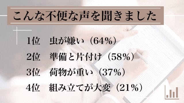 過半数を超える回答に、「虫が嫌い」「準備とかたづけに時間がかかる」と感じている実態が明らかになりました。