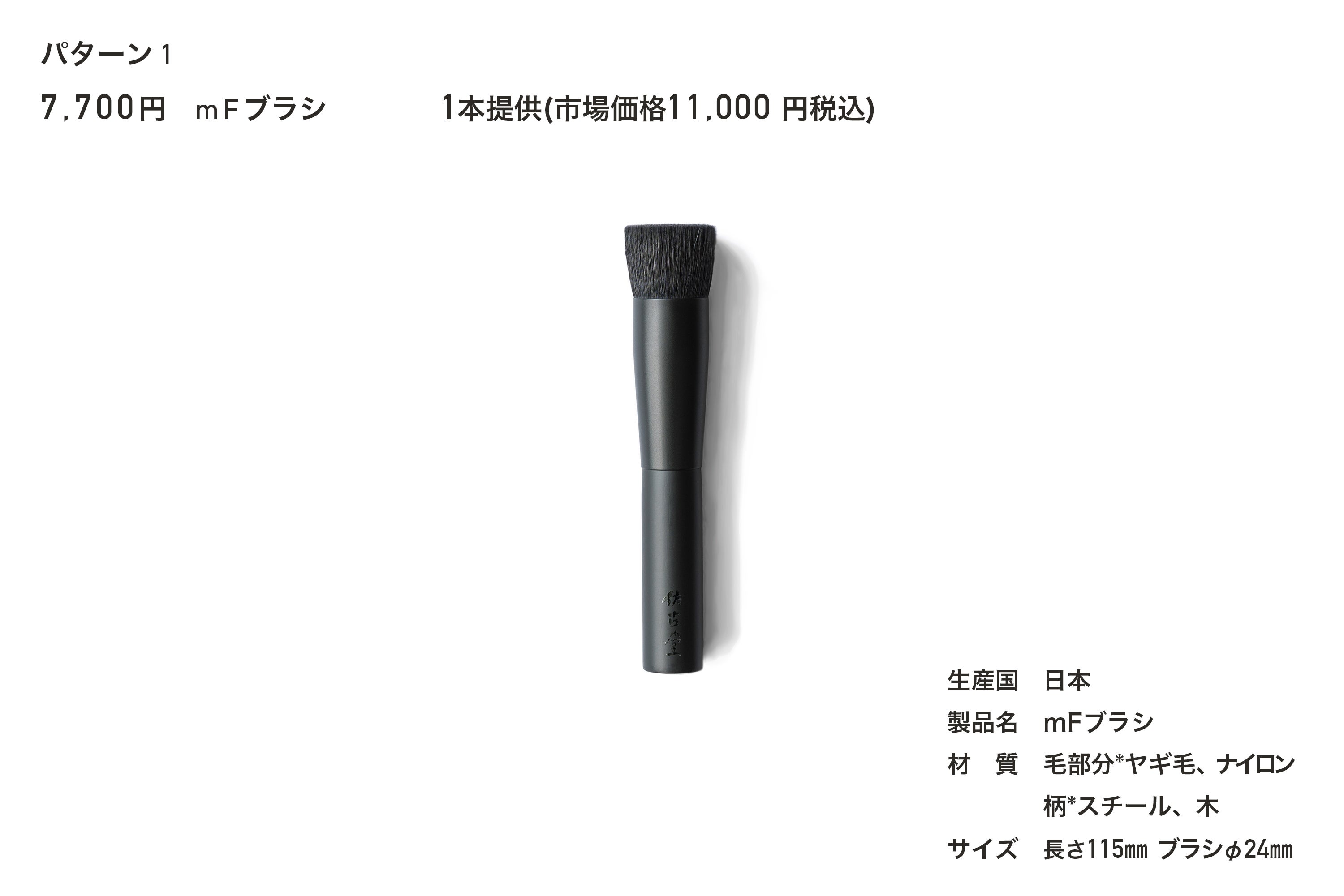 "mFブラシ"は、ファンデーションを指やスポンジ、パフ等で伸ばした場合よりも、毛穴や皮膚の凸凹を目立たなくする、タッピング機能性がかなり高いです。もっときれいに、もっと薄づきにという願いを追求したとき、一般のメイクブラシには無い独自の仕様として「毛に弾力とハリがあり、肌にブラシ表面が密着すること、また数ヶ月間毎日使い続けても毛束がペタッとくっつかない」そして「もっと簡単に均一にのばせるもの」であることは必須、盛り沢山な条件を全て達成させるため、筆作り120年の老舗、広島の仿古堂(ほうこどう)に依頼、共同開発。