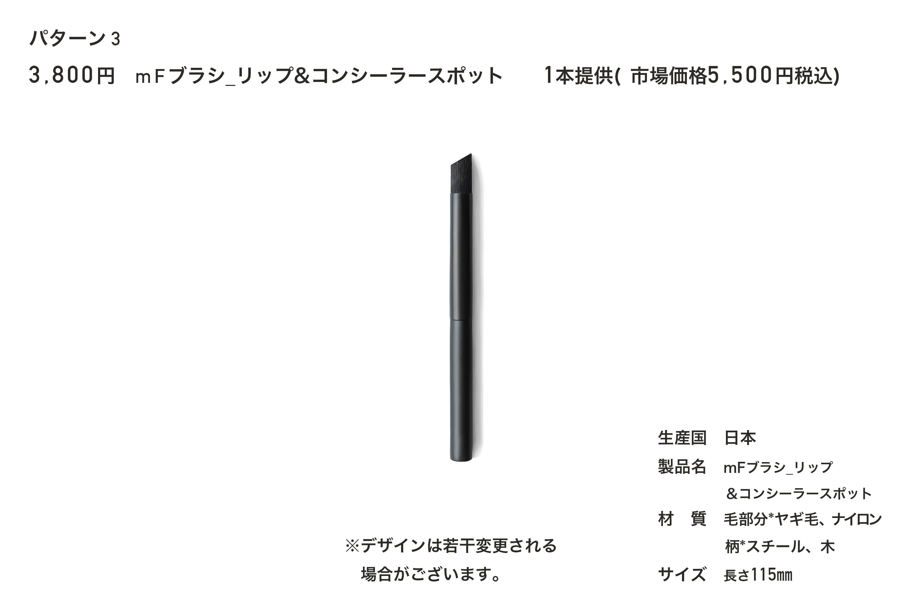 今回、セット展開する"mFブラシ_アイシャドウ&アイブロウ"は、ふわっとカラーパウダーを含むための柔らかい毛の面と、アイライナーが描ける(ノーズシェイドも!)テンションの高い毛を共存させた多機能プロダクト、リップブラシ"mFブラシ_リップ&コンシーラースポット"は、その独特な毛束が作る形と組み合わせる毛質により、手が震えてもきれいに描けるリップラインを実現、更には、ブラシを軽くティッシュなどで拭うだけで、コンシーラーのスポット使いにも重宝します。