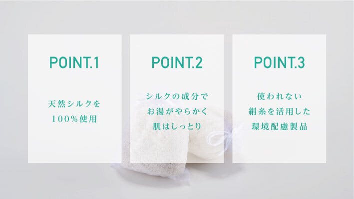 「絹糸の湯」は絹・生糸をそのまま生かしたバスアイテムで、特徴は以下の3点です。