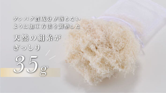 本製品1つに、35gの絹糸がしっかり詰まっています。絹糸の成分がゆっくり溶け出すので、2~3回程度は繰り返し使用することも可能です。
