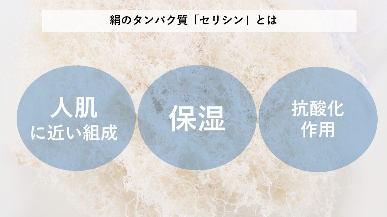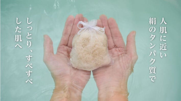 セリシンは絹の主成分のひとつである水溶性のタンパク質で、組成が人の肌に近いことや、保湿性や抗酸化作用などの機能を持つことが既存の研究で知られています。水溶性のためお風呂に浮かべたときに成分が溶け出し、肌にやさしい保湿作用をもったバスアイテムとなります。お風呂上りに肌がつるっと、しっとりする感覚や、お湯が柔らかくなる感覚を楽しむことが出来ます。