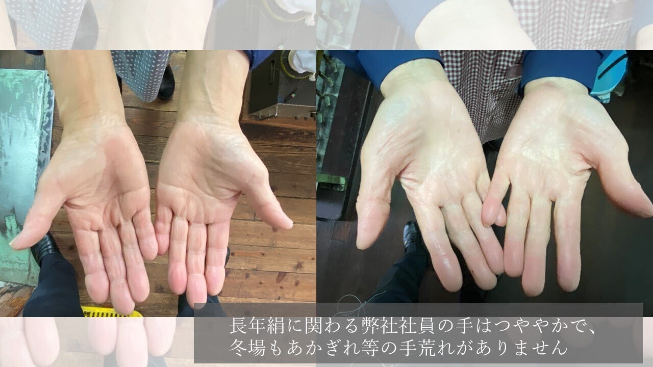 絹の成分であるセリシンには美肌効果、保湿効果があると言われており、実際、弊社の社員の中でも絹糸の加工を行う職人の手は、とてもみずみずしく、美しさが保たれています。