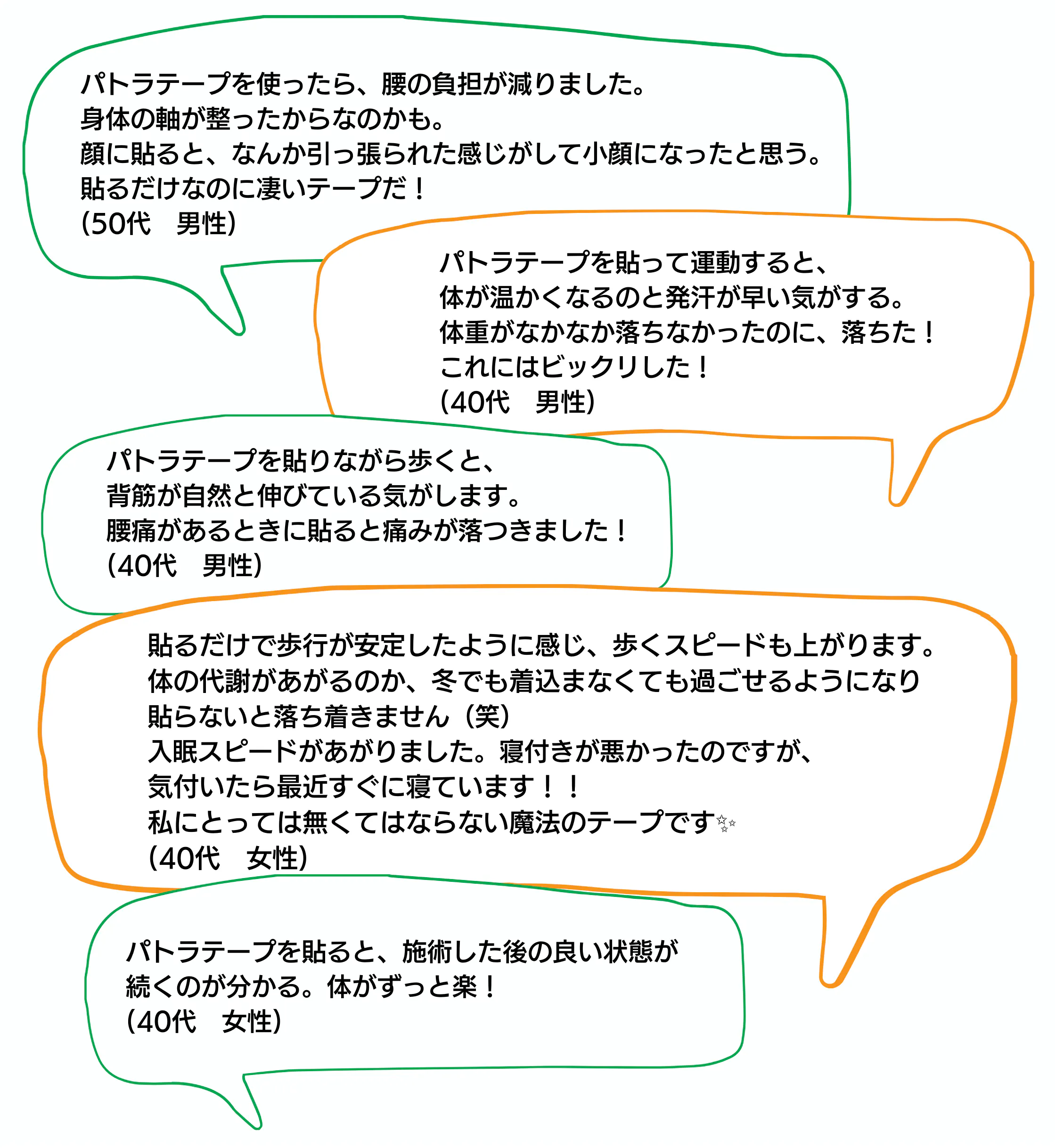なかなか外に出られない、人前ではマスクを手放せない、旅行に行くこともできない...。本当に多くの方が、やりたいことを我慢して生活しています。そんな状況でもストレスをためずに元気でいられるように、一人でも多くの方に【パトラテープ】を活用していただければこんなに嬉しいことはありません。【パトラテープ】は自宅ケアでより健康になりたい皆様に、最適のアイテムです。是非この機会にお試しいただけますよう、どうぞよろしくお願いいたします。