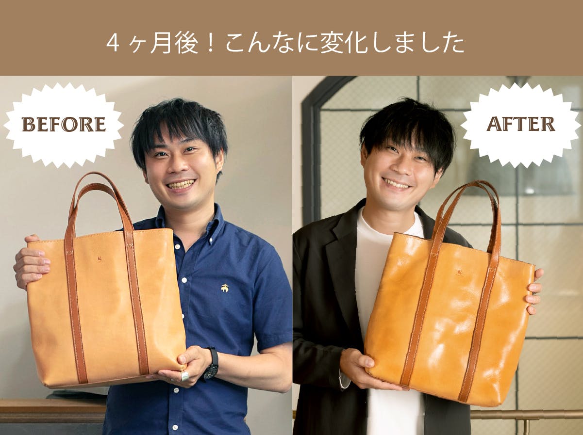 仲良しの大友店長にバッグをプレゼントして、革がどのように変化するのか実際に体験していただきました!この革は雨の日も風の日もガシガシ使った方が良い味が出るとのこと。4ヶ月後にはどのような色になっているのでしょうか。