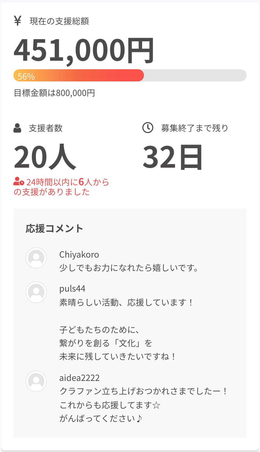 今現在、20人もの人にご支援していただき、達成率は56%で451,000円となっております!(1月30日22:58現在)