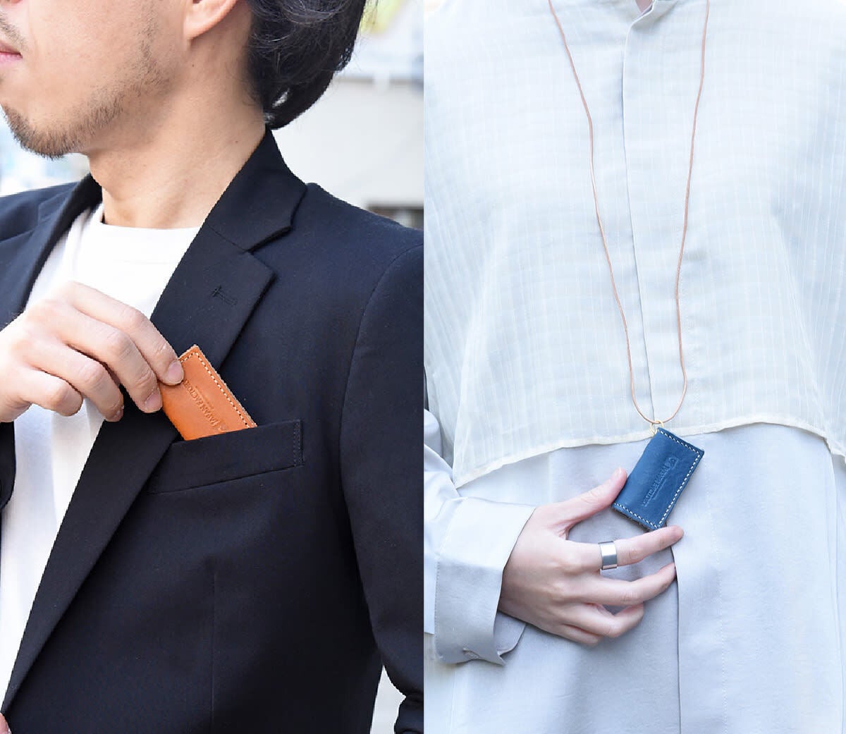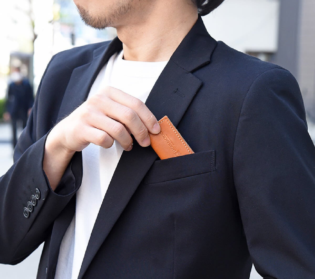厚さわずか0.7cmで、内胸ポケットにしまってもしっかりスタイルをキープできる。