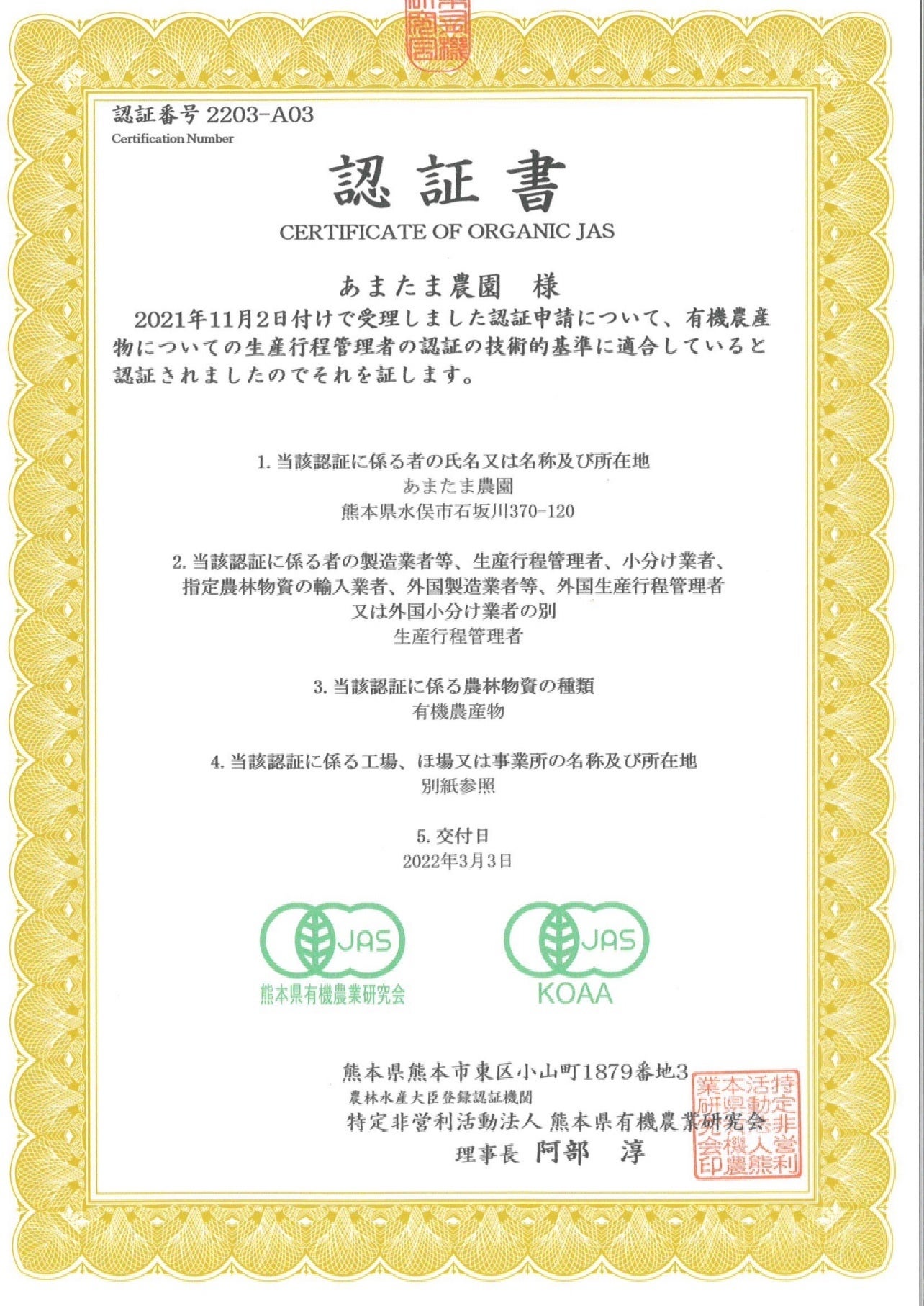 有機の専門機関にお願いして、有機JAS認定の認定証を取得しました。