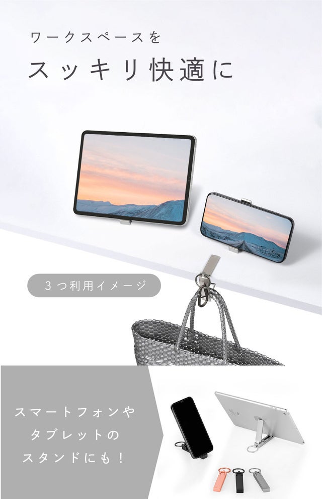 荷物を掛けない場合もスマホやタブレットのスタンドとして活用できるため重宝します。