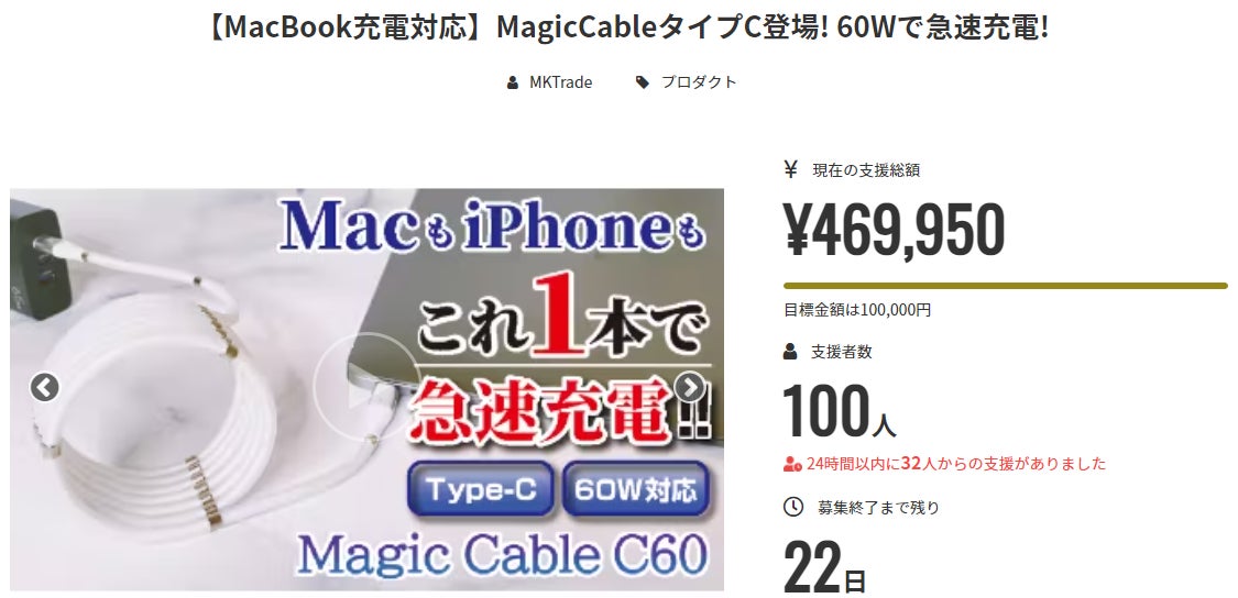 『Magi Cable C60』は、60W対応となりパソコンの急速充電も出来る、充電ケーブルです。