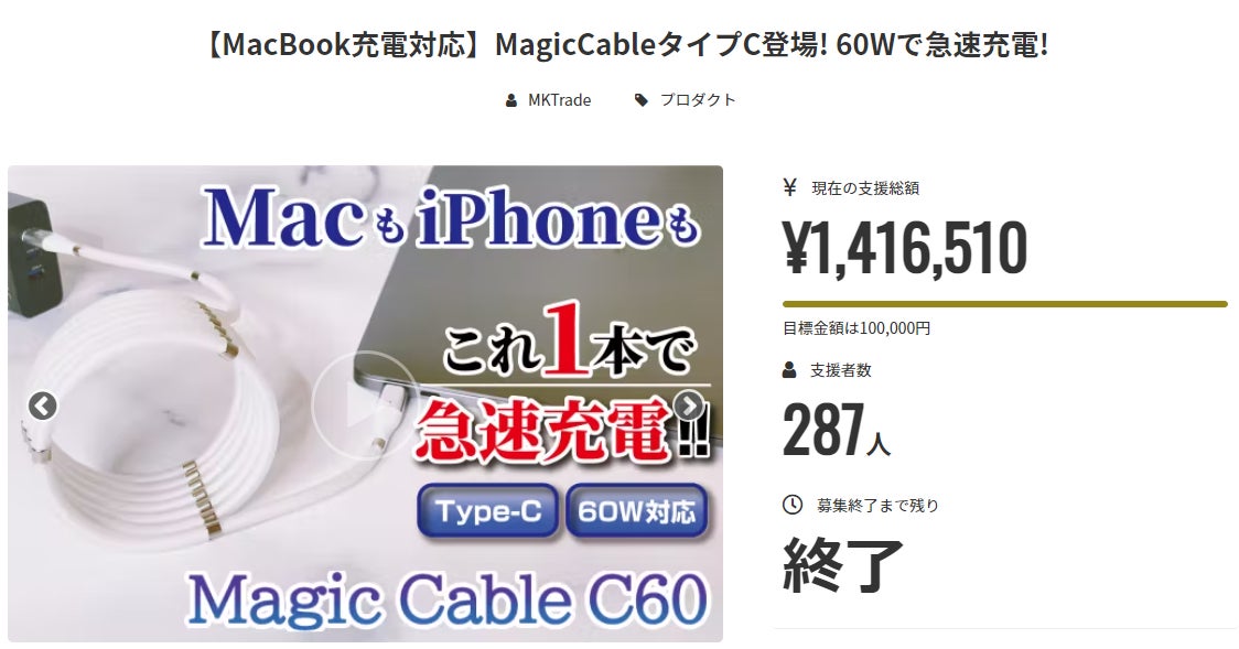 お世話になっております。MKトレードです。おかげさまで、無事に「【MacBook充電対応】MagicCableタイプC登場! 60Wで急速充電!」プロジェクトが公開終了となりました!「287名様」と、たくさんの方からご支援いただき、『Magic Cable C60』スタッフ一同、心より御礼申し上げます。『Magic Cable C60』は1本あればパソコン・スマホと両方の充電可能な商品ですので、皆様の生活の中でお役に立てていただけることを願っております。お届けまではしばらくお待たせいたしますが、しっかりと準備を進めさせていただきます!進捗等は「活動報告」としてご案内いたします。改めまして、この度はご支援いただきまして、誠にありがとうございます。引き続き、どうぞよろしくお願いいたします。 『Magic Cable C60』プロジェクトスタッフ一同