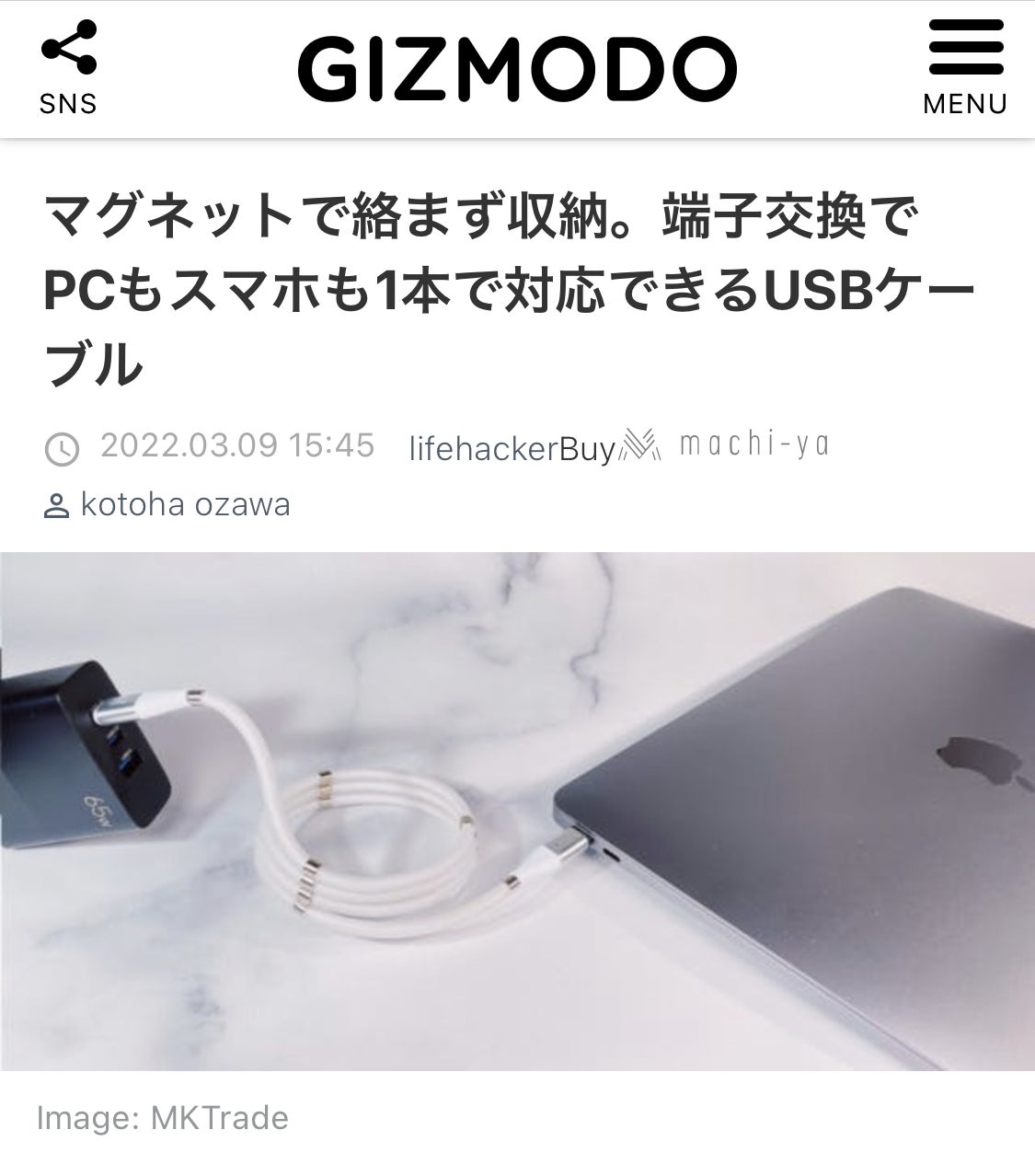 お世話になっております。MKトレードです。『Magic Cable C60』プロジェクトが「ギズモード」様に紹介されました!マグネットで絡まず収納。端子交換でPCもスマホも1本で対応できるUSBケーブルhttps://www.gizmodo.jp/2022/03/machi-ya-magiccablec60-start.html分かりやすく紹介いただいているので、ぜひご確認ください!また、ご支援金額により応募いただくと『もれなくもらえるお得なキャンペーン!』を実施しております!詳しくは、プロジェクトページ中ほどをご確認ください。引き続き、どうぞ宜しくお願いいたします!『Magi Cable C60』プロジェクトスタッフ一同