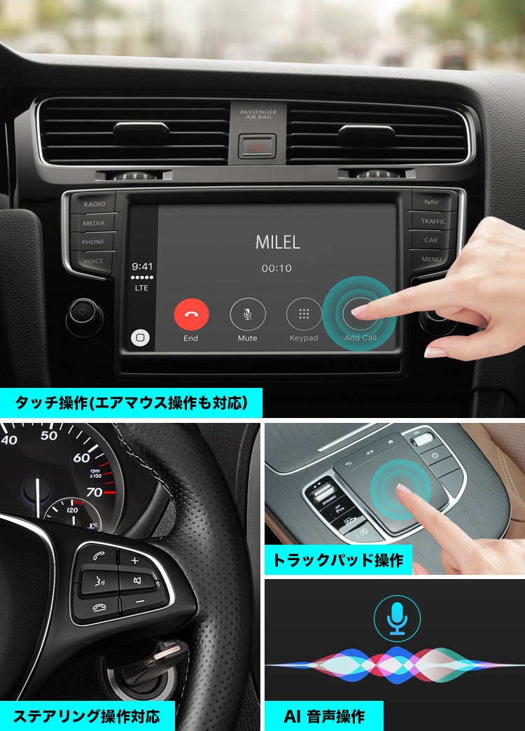 ※AppleCarPlayは2016年以降のものに対応しますが車の車種によっては不適合の場合があります。現在BMWでは動作しない事を確認済みです。