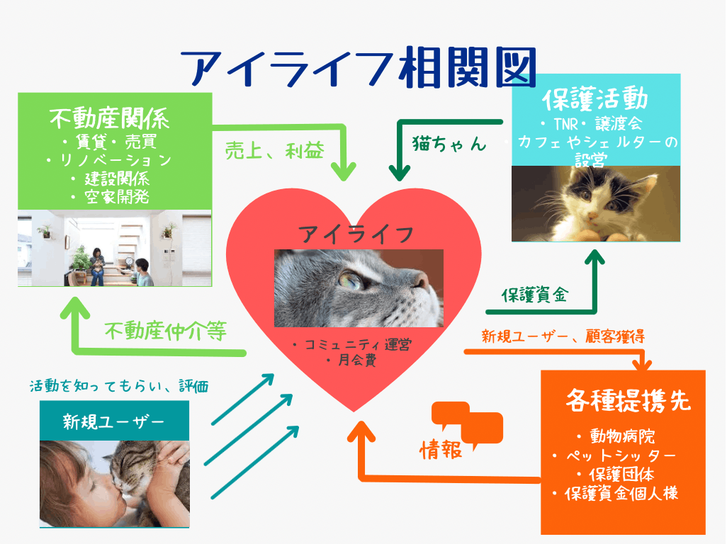 上記相関図をご覧になれば分かるように、皆様のコミュニティ月会費は保護活動、提携先確保、不動産関係、そして新規ユーザー獲得の為に使われます。コミュニティの管理費以外に固定費等はございませんので、金銭の問題で途中で経営破綻、コミュニティ解消という心配はございません。