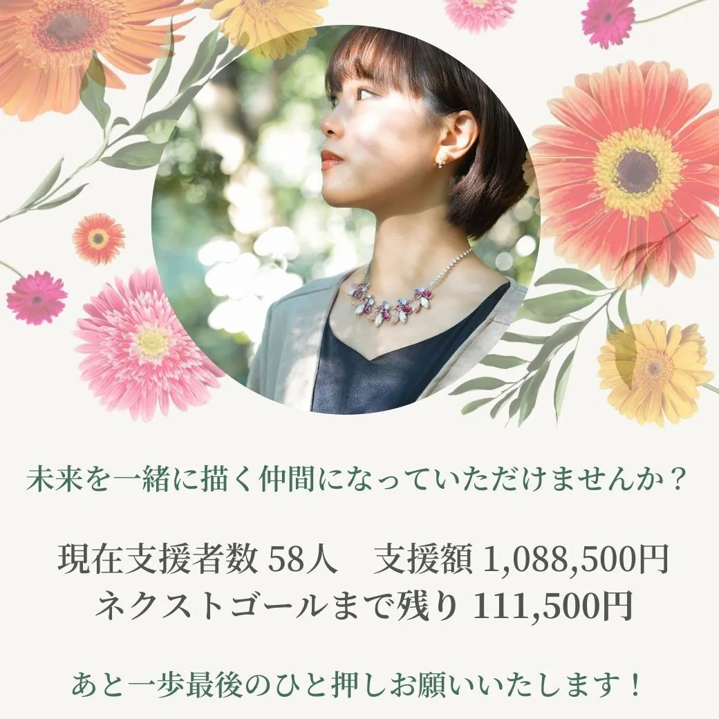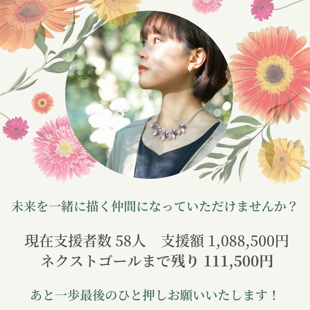 現在支援者数 58人、支援額1,088,500円、 ネクストゴールまで残り111,500円、あと一歩最後のひと押しお願いいたします。