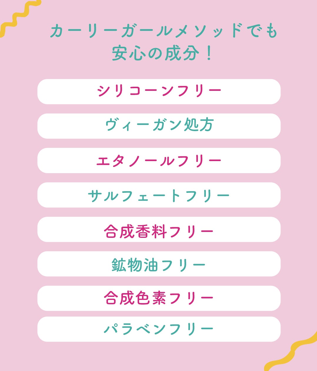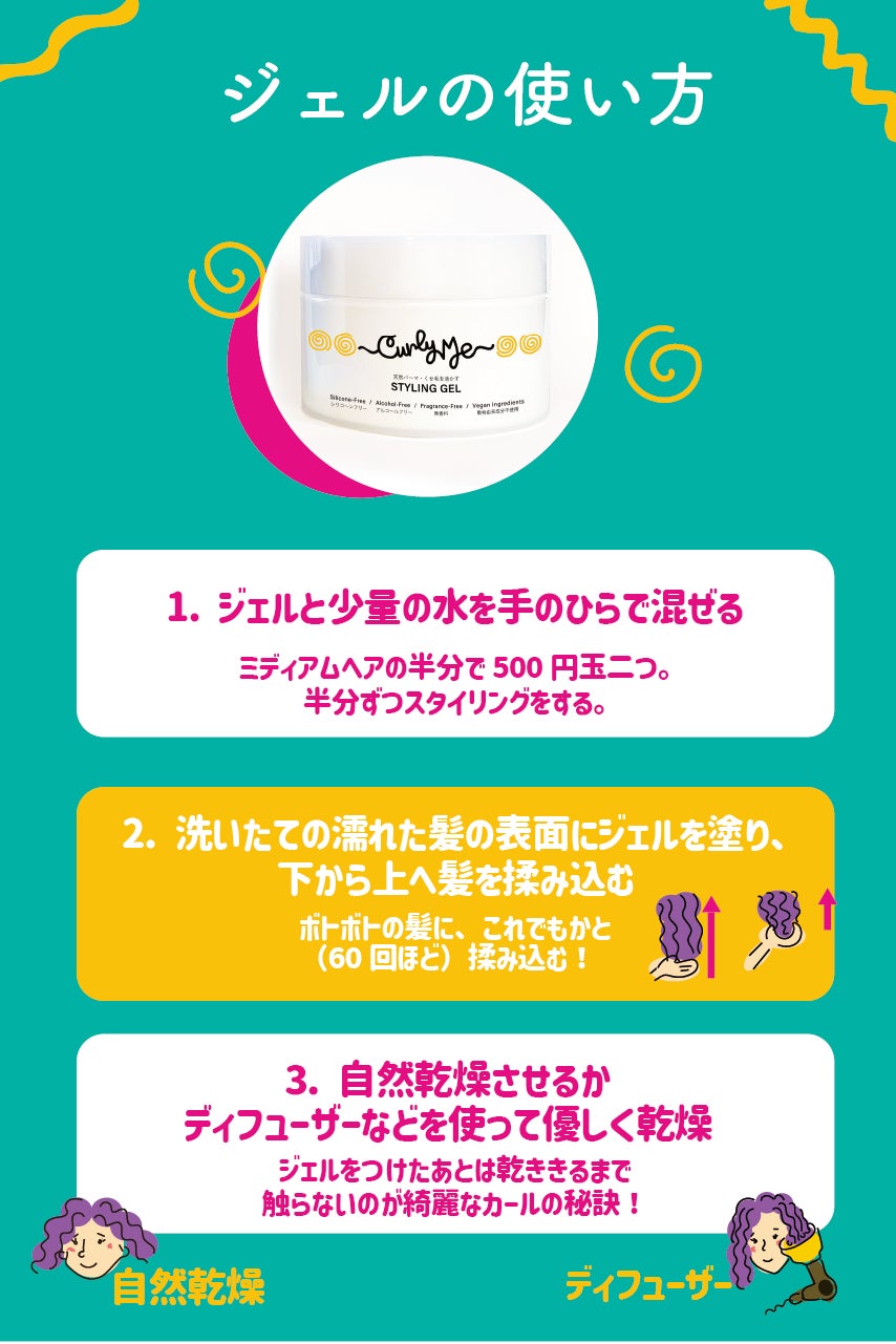 又海外でも流行りの「カーリーガールメソッド」でも使えるシリコーンフリー、エタノールフリー、サルフェートフリーの商品となっています。安心してヘアケアをしてください!