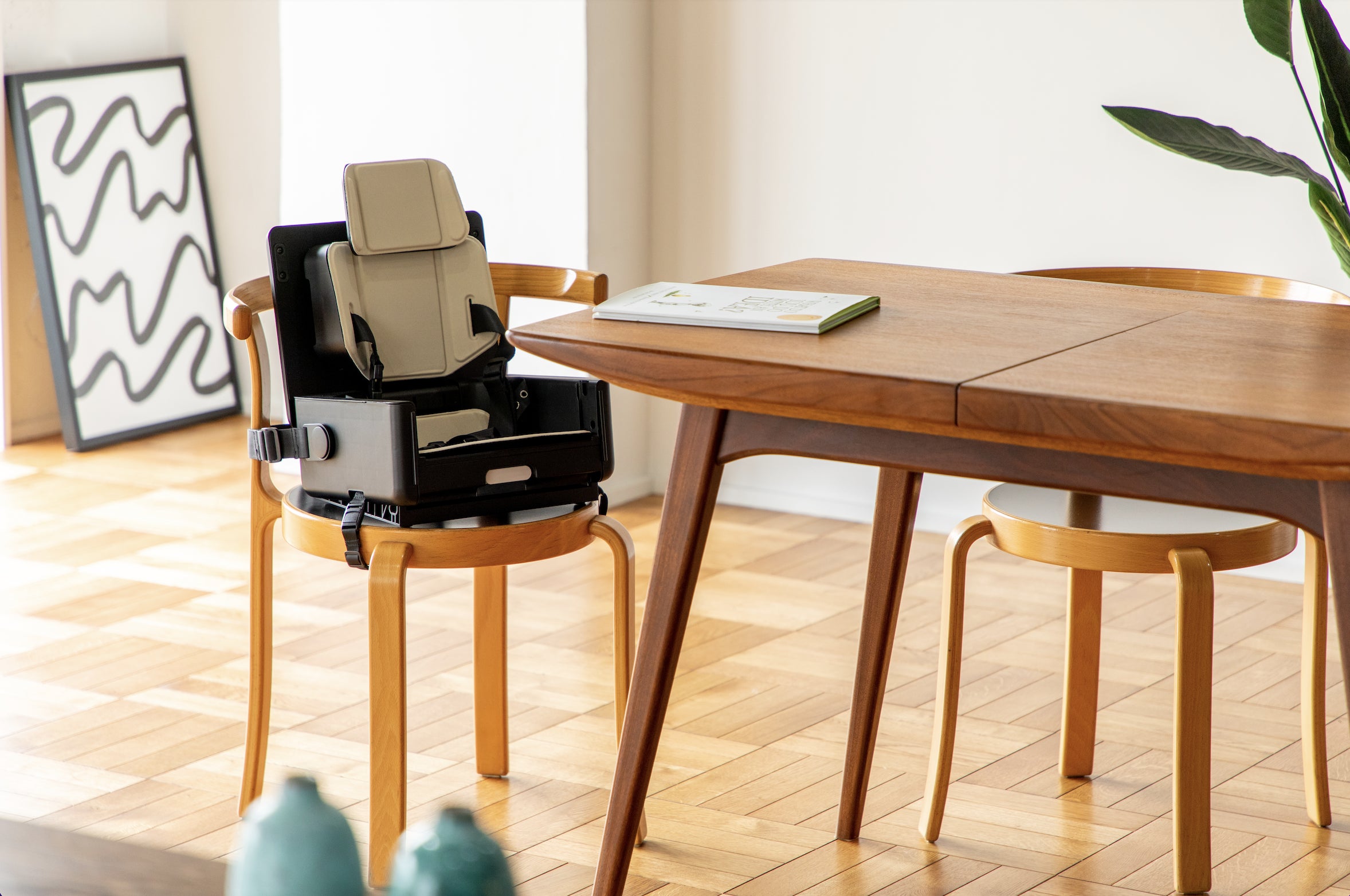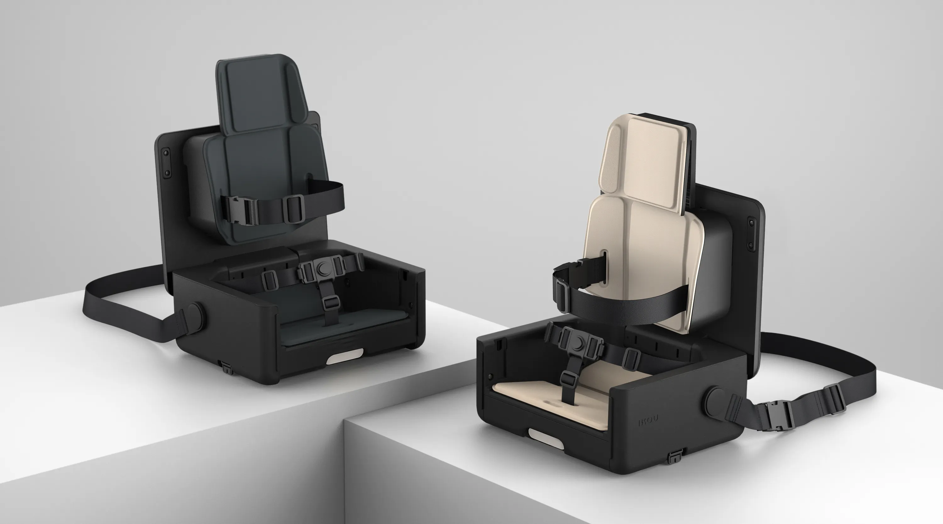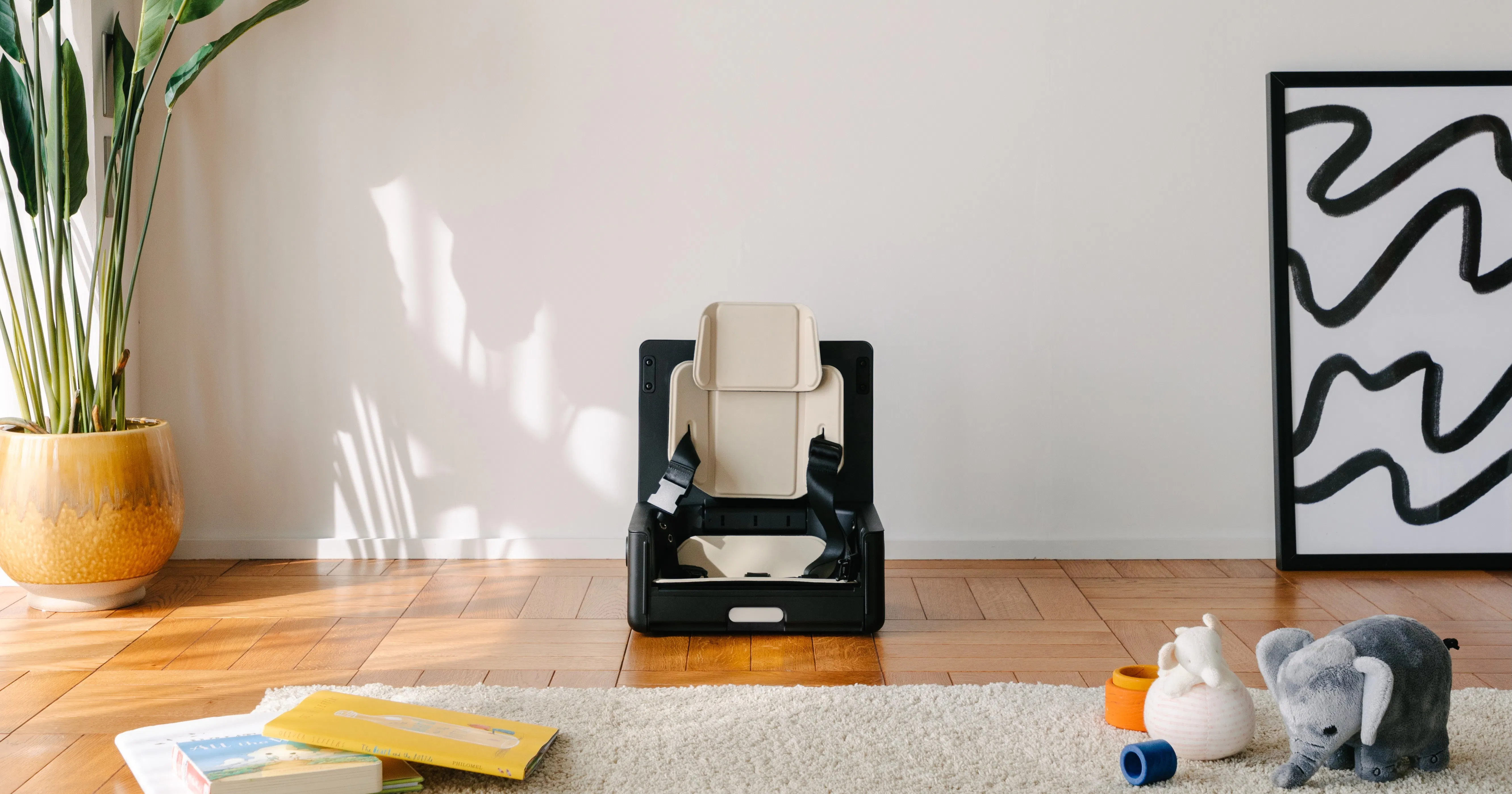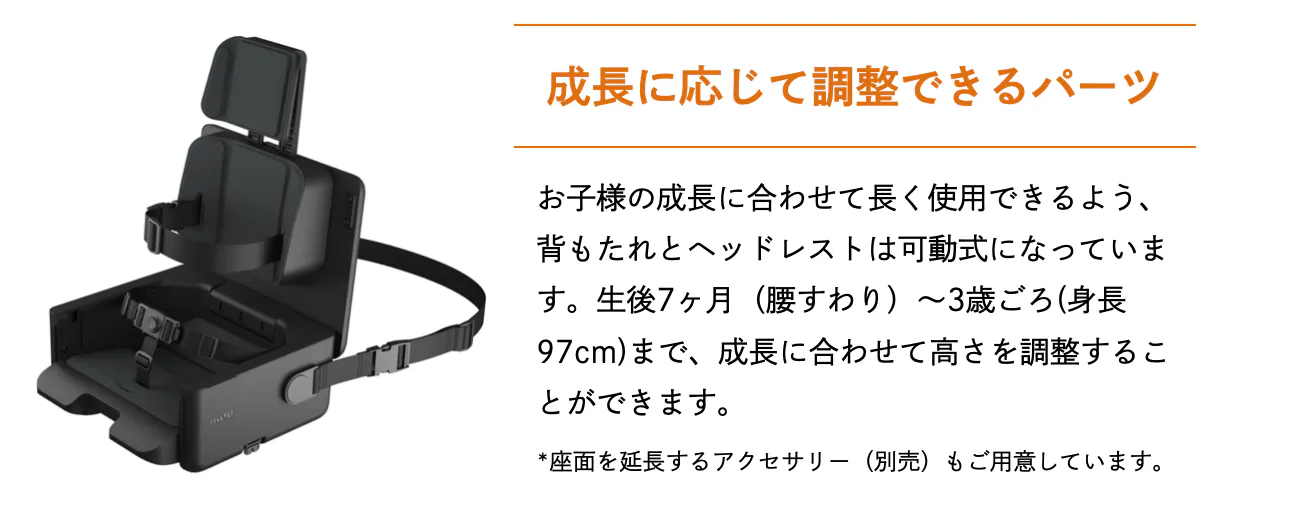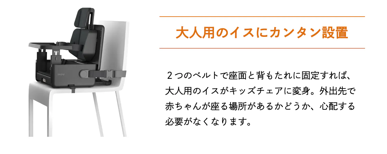 家の中はもちろん、外出先のレストランやホテル、スタジアムでのスポーツ観戦など大人用の椅子に設置してお使いいただけるほか、床置きも可能なため、キャンプやピクニックでも活躍。移動の際はコンパクトに折りたたんで、肩がけまたは斜めがけで持ち運ぶことができます。
