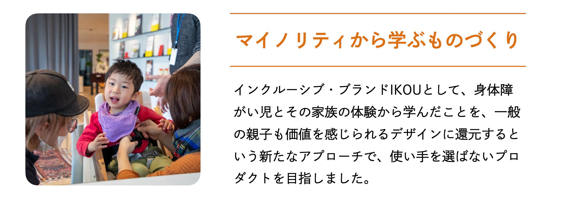 IKOUは、身体的にチャレンジを抱える子どもたちとその家族の視点、体験に着目し、その学びを一般の子どもたちとその家族にとっても価値を感じられるデザインに還元することを、プロダクト開発におけるアプローチの指針としています。