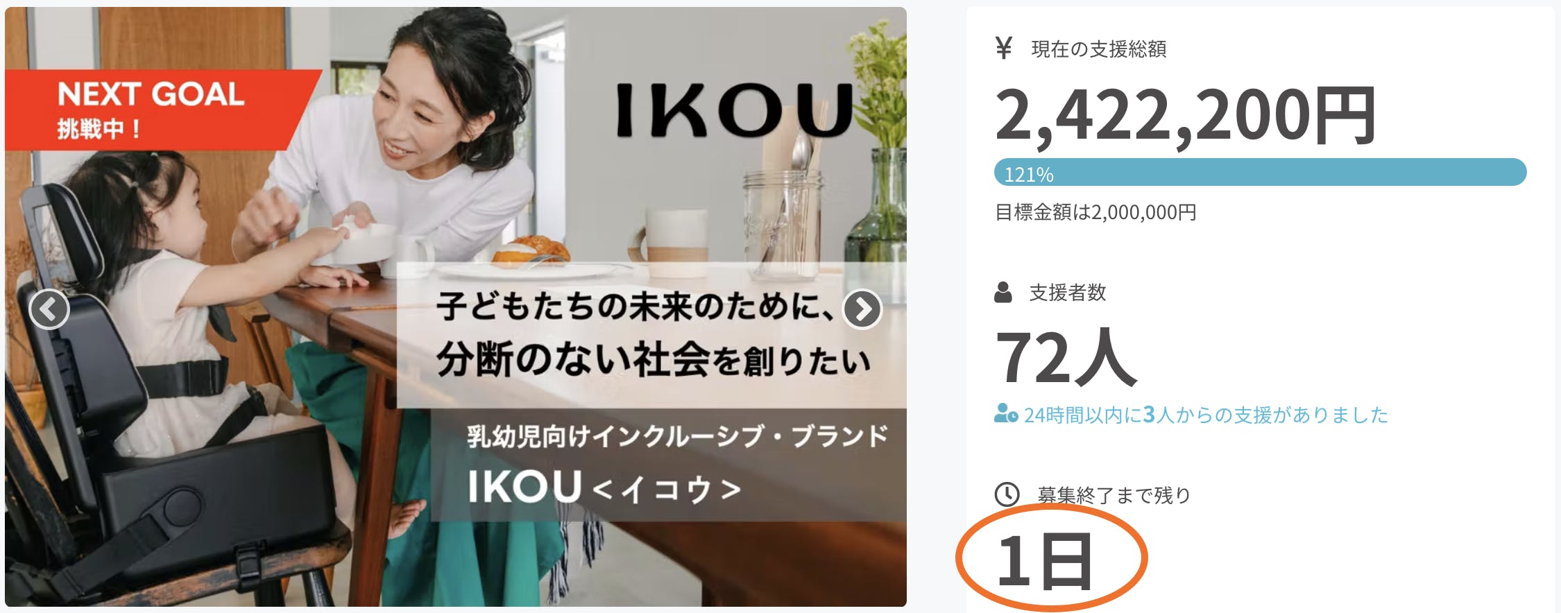 2022/04/09 15:38本クラウドファンディングも、いよいよプロジェクト終了まで残り1日となりました。ご支援の募集は、明日4/10(日) 23:59までで締め切りとなります。このクラウドファンディングを通して、IKOUという事業、そして私自身を応援してくださる皆さまとの間に生まれた繋がりが、何よりの成果であり宝物です。ご支援くださった皆さま、本当にありがとうございました。ラストスパートにお力をお貸しいただければ幸いです。最後まで、どうぞよろしくお願いいたします。<メディア掲載のお知らせ>昨日、BUSINESS INSIDER JAPANにて「『新卒トヨタで9年』から起業。持ち運べるキッズチェアからインクルーシブな社会目指す」という記事が公開されました。新卒でトヨタ自動車に入社して、出産、起業を経てIKOUポータブルチェアが生まれるまでの過程をを丁寧にストーリーにしていただきましたので、是非ご覧ください。<これまでのメディア掲載>2022/3/19 FAIR PLAY TALK 「みなが同じ目線で暮らす世界へ。”IKOUの挑戦”」2022/3/14 Forbes JAPAN 「モノを変え、意識を変える インクルーシブ・ブランド IKOUの挑戦」2022/3/10 GIZMODO「折りたたんでショルダーバッグのように運べるチャイルドシート。リクライニングもできてアウトドアにも」2022/3/7 AXIS Magazine 「インクルーシブな社会創りを目指す乳幼児向けの「IKOU ポータブルチェア」」2022/3/4 日本経済新聞(日経MJ)「座位保ちやすい軽量キッズチェア」 2022/2/13 京都新聞 「全ての人にとって価値ある製品を 長男のリハビリ経験で起業決意」 もっと見る