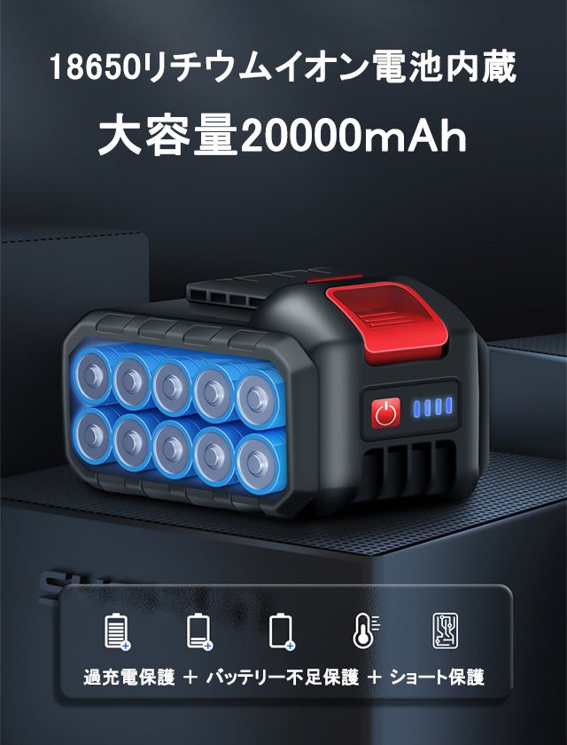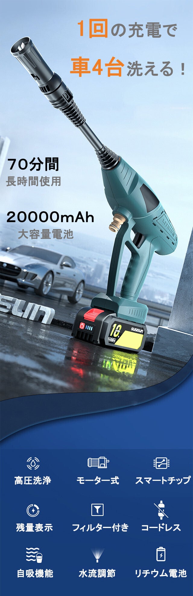 容量20000mAhの18650リチウムイオン電池を内蔵。フル充電で最大70分の連続稼働させることができ、広い範囲を洗浄したい時にぴったりです。