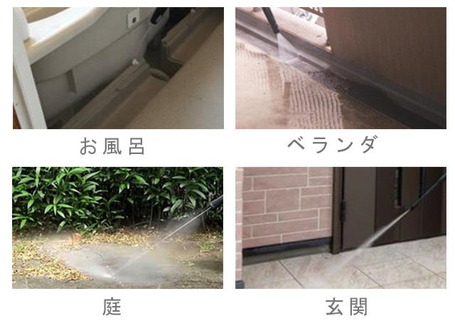 水流を調節してさまざまな用途に使えます。玄関周りや庭の土汚れはもちろん、窓や網戸のほこりや花粉を洗い流したり、外壁の苔や黒ずみを除去したりと、色々な種類の汚れを落とすのに役立ちます。