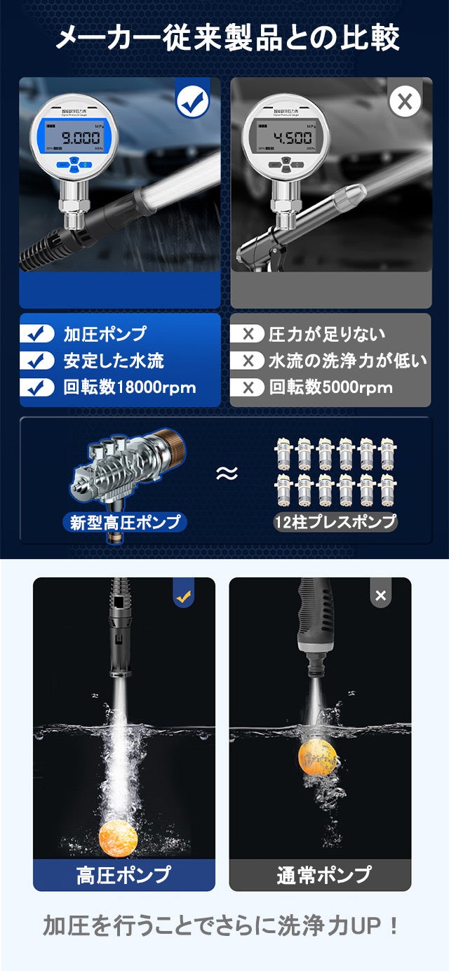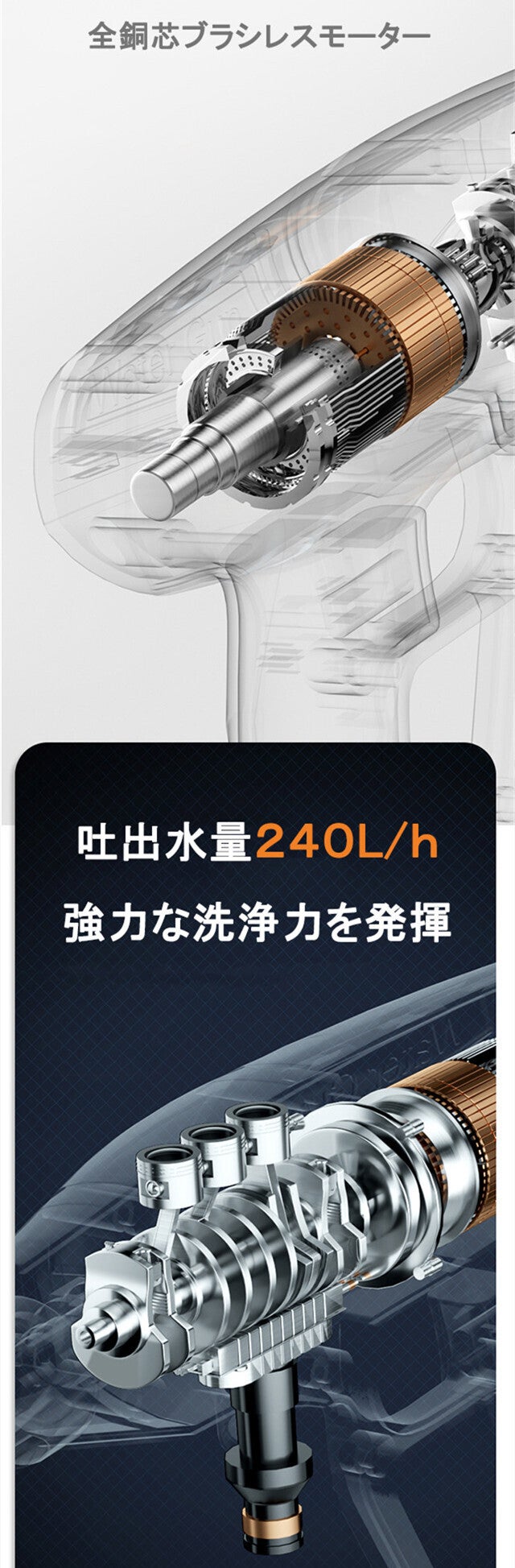 130Wのパワフルなモーターを搭載。水道水圧の何倍も吐出可能であり、240L/hの吐出水量で車についた汚れを軽々と洗い流せます。