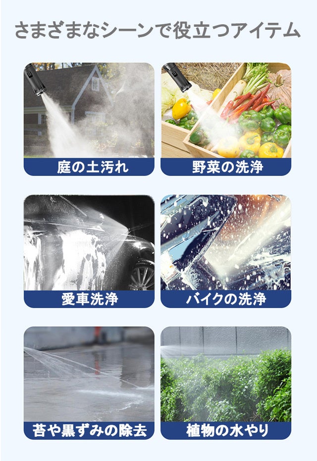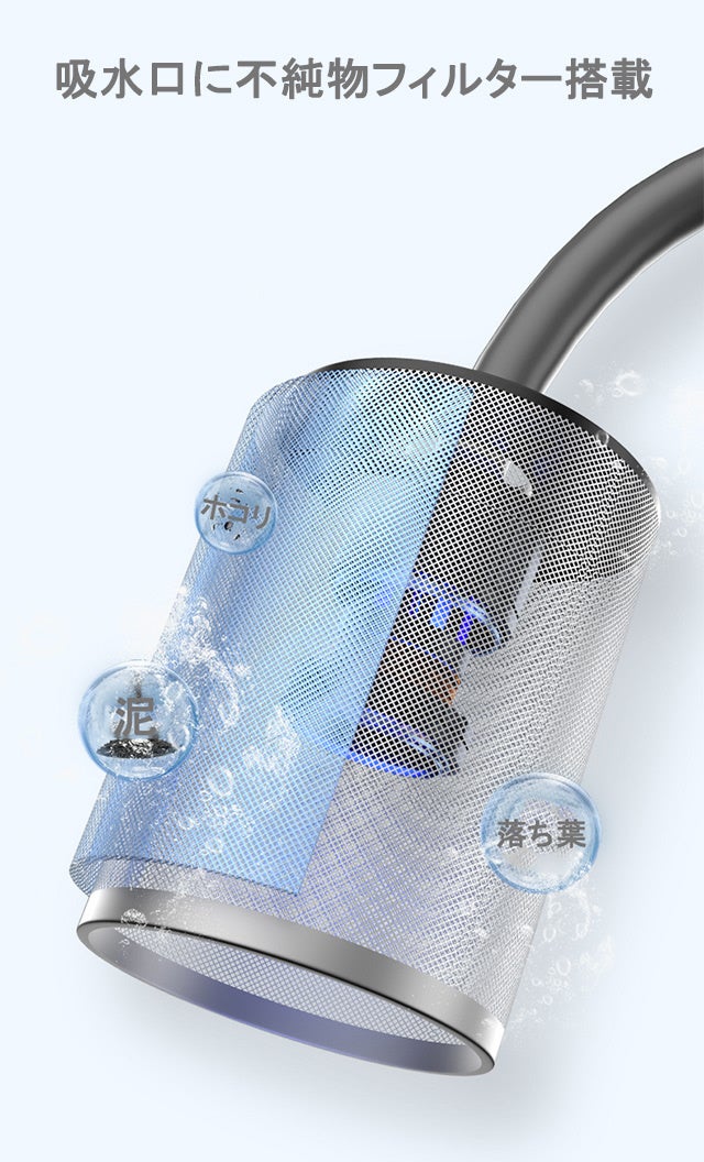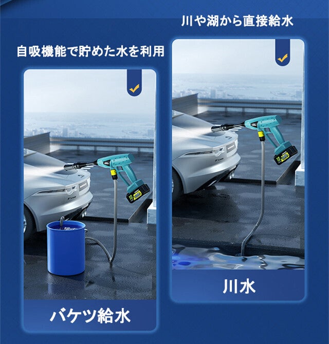 充電式なので電源がない場所はもちろん、自吸機能つきのためバケツなどに水を溜めれば水道がない場所でも使用可能です。