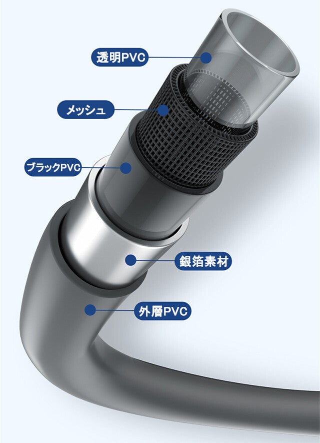 溜め水を吸い上げるためのホースセット付属。多層式構造を採用し、水圧で伸びたり破裂したりすることもありません。