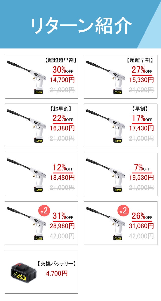 付属品:SUI本体×1、バッテリ×1、洗剤タンク×1、高圧ノズル×1