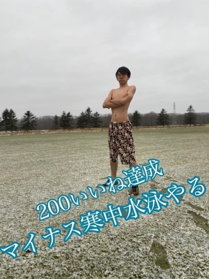 Twitterのいいねが200超えたら、マイナス35度真冬の北海道で寒中水泳をしまっすっていったりとか