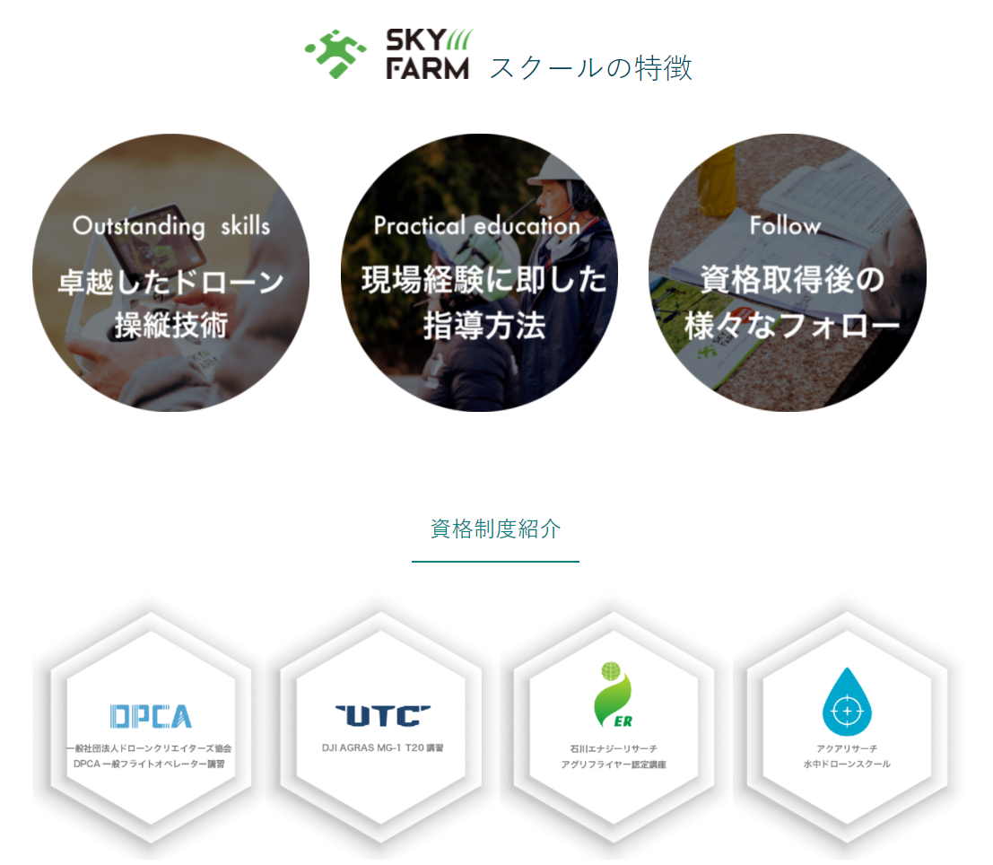 SKyFarm🄬では、ドローンを活⽤した農業サービス事業の他にも、ドローンの免許取得のス クールの開講やインストラクターの派遣事業も実施しています。