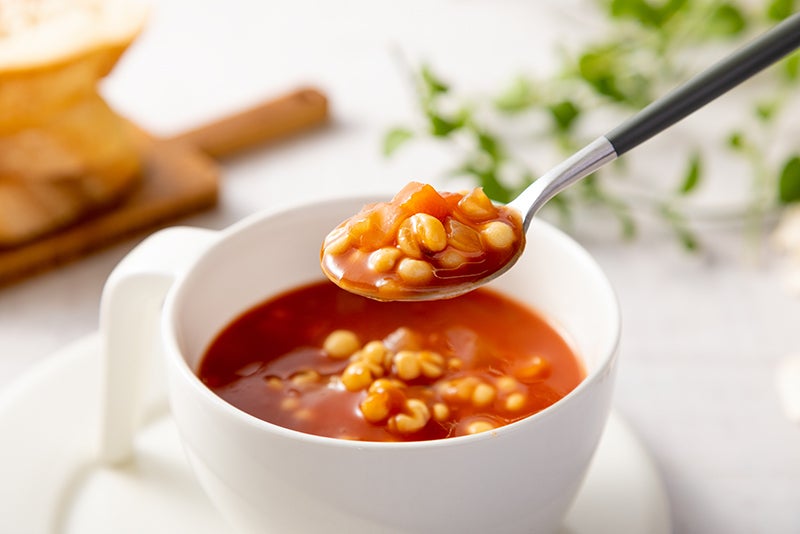 ミネストローネはイタリア語では『具だくさんのスープ』。たっぷりのハトムギ、にんじん、セロリ、玉ねぎをトマトベースで程よい酸味のシンプルな味付けのスープに仕上げました。ハトムギの強い存在感はまさに「ハトムギを食べる」スープです。