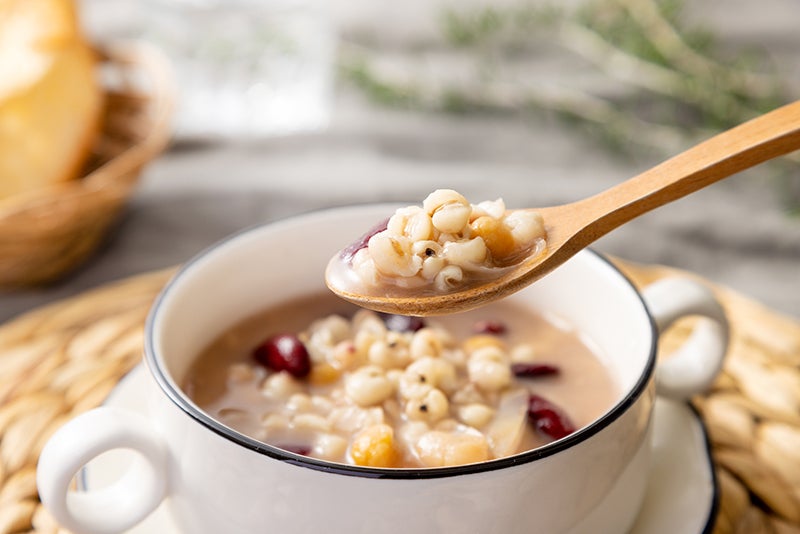 たっぷりのハトムギと3種の豆(赤いんげん、白いんげん、ひよこ豆)に、コクのあるチキンベースのスープ、ホワイトペッパーで香り付けをしました。 ハトムギの滋味あふれる深みを楽しめるスープです。
