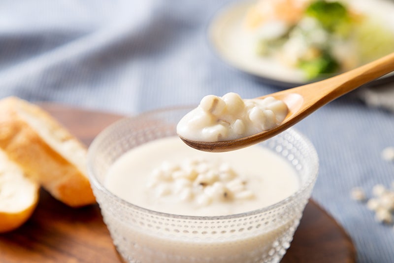 じゃがいもと玉ねぎベースのフレンチクリームスープにハトムギがたっぷり入っています。あっさりした中にもコクのあるクリームスープは冷やしても温めてもよし。ハトムギを美味しくお召し上がりください。