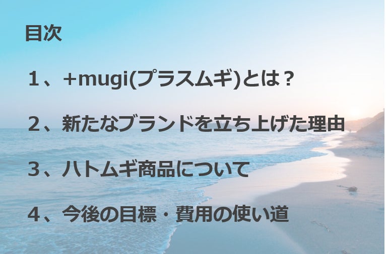 今回は新しいブランド「+mugi (プラスムギ) 」の健康食品を皆様にお届けし、新たな健康食品を開発するために今回のプロジェクトを実施します。