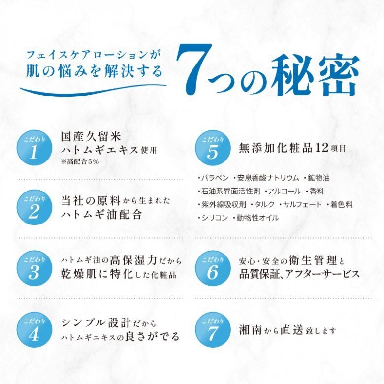 ハトムギエキスには10種類以上の健康に関係する成分が含まれています。このハトムギに着目し、湘南の地でハトムギの会社を続けている私達だからこその化粧品を完成させました。