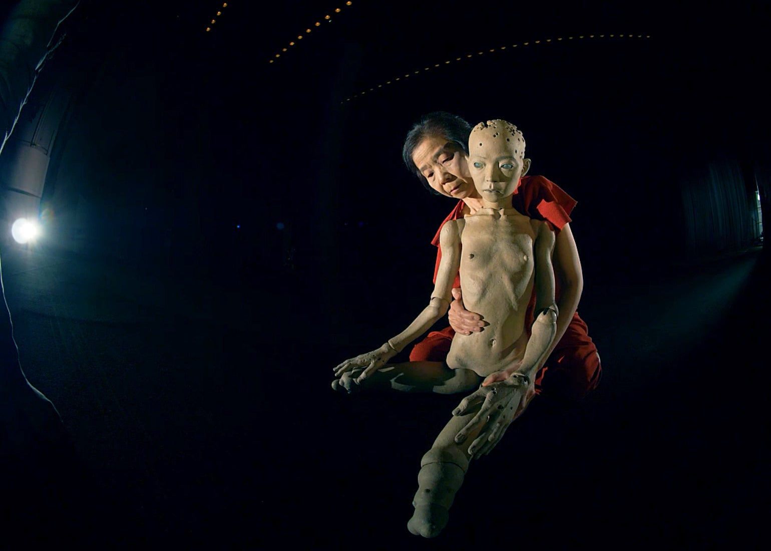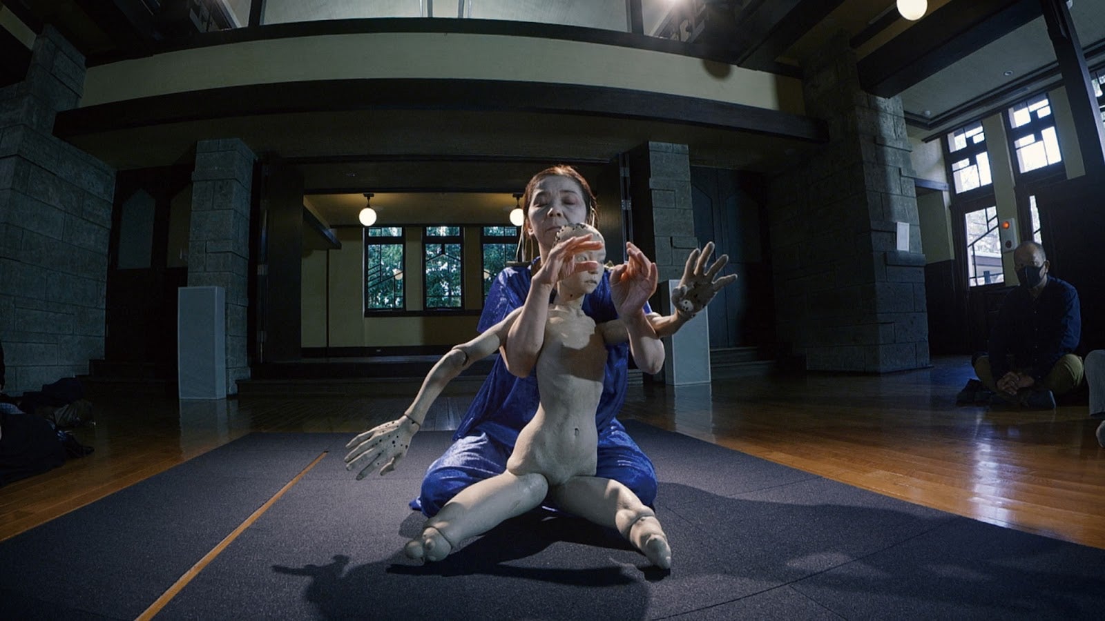 今回取材した『もうひとつの眼 / もうひとつの身体』は、そうした前2作の延長線上に、最上さんの舞踏を、飯田監督の「もうひとつの眼」たるカメラがオンライン配信のために収録していく様子を、厳粛な「儀式」としてライブで観客に体験させようという試みだったわけです。最上さんは最上さんで、自分の身体の内奥で起きていることをより外部の他者に伝わりやすくするために、人形作家の井桁裕子さんが制作した球体関節人形を「もうひとつの身体」として使役。舞踏家と映像作家が、それぞれの扱う「もうひとつの眼」と「もうひとつの身体」を介することで、お互いに歩み寄りつつも対決する、鬼気迫る緊迫感あるセッションが行われました。