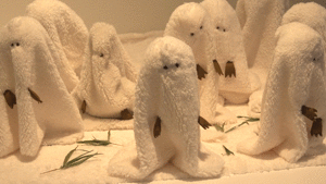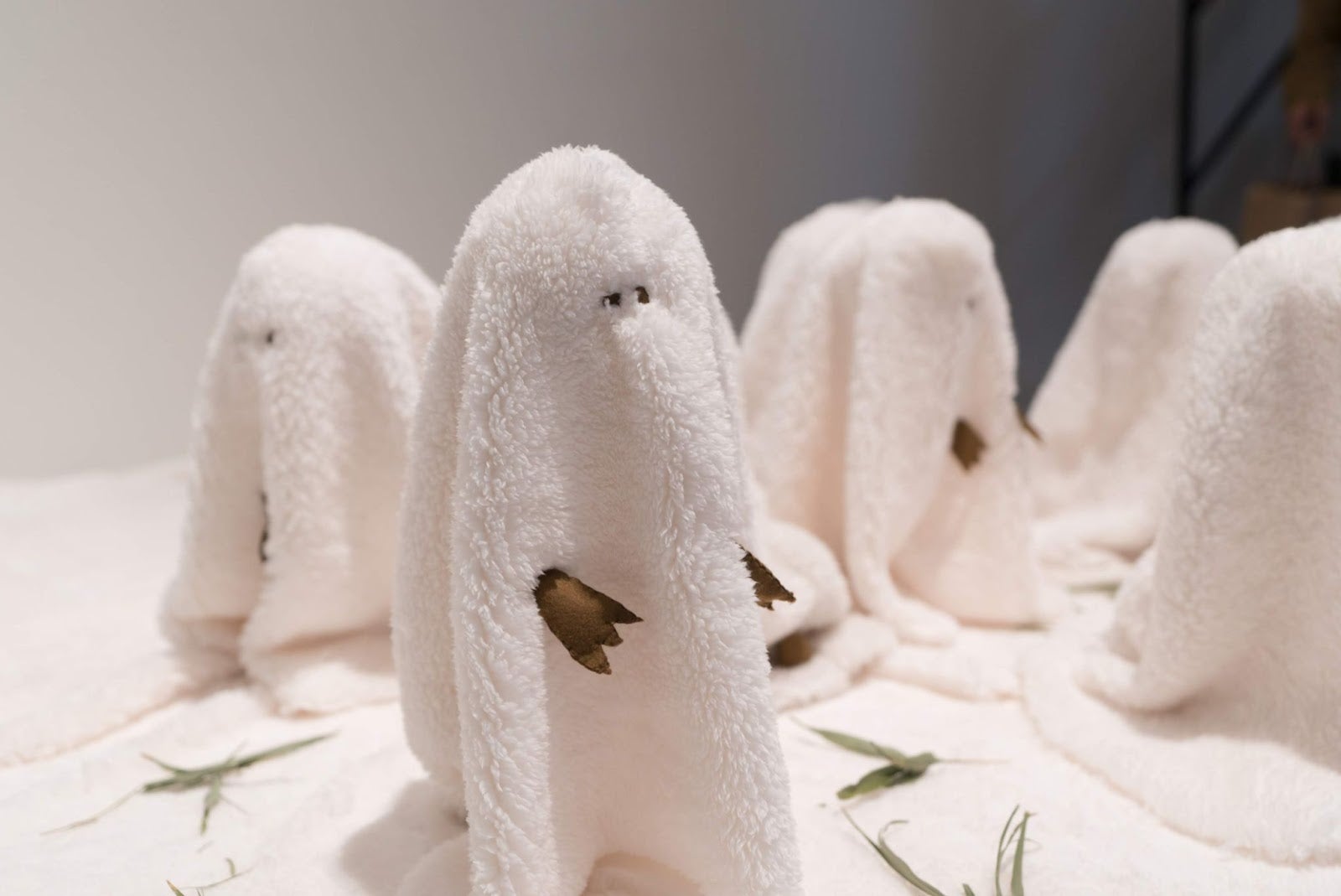 作品のひとつ「ネオアニマ.にゅう!にゅう!にゅう!」では、それぞれ独自の動きをする「にゅう」を群で展示することで、ロボット同士の「社会性」をテーマに表現しています。ここまで多くのタオル的な物体がうねうねと動いているのはかなりシュールな光景で、クラゲを見ているような、なんともいえない気持ちになります。
