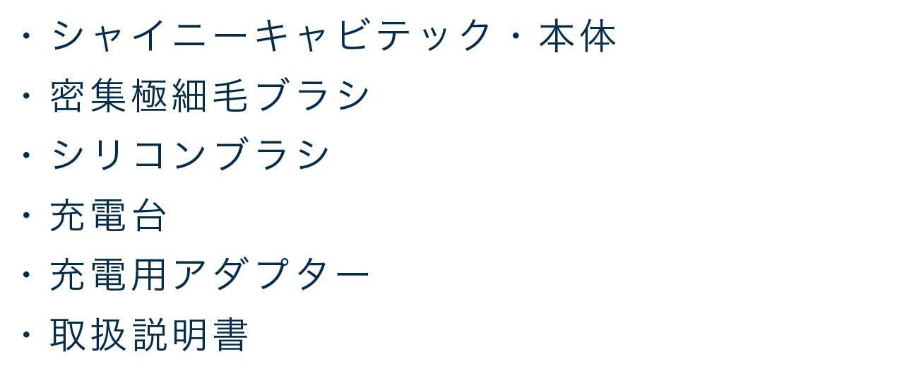 ・シャイニーキャビテック・本体/密集極細毛ブラシ/シリコンブラシ/充電台/充電用アダプター/取扱説明書(日本語)