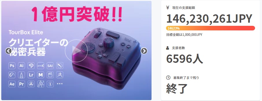 TourBox EliteのCAMPFIRE日本初公開プロジェクトは大盛況のうちに終了しました!総支援額1.4億円超え、支援者数6600人近い!