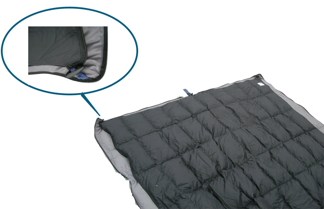 夏場のキャンプなら、シュラフに潜らなくても良い気候の時もあります。そんな時は2枚を大きく開いて4方についているトグルをとめて掛け布団、敷布団に早変わり♪いつ持って行っても無駄にならないシュラフです。