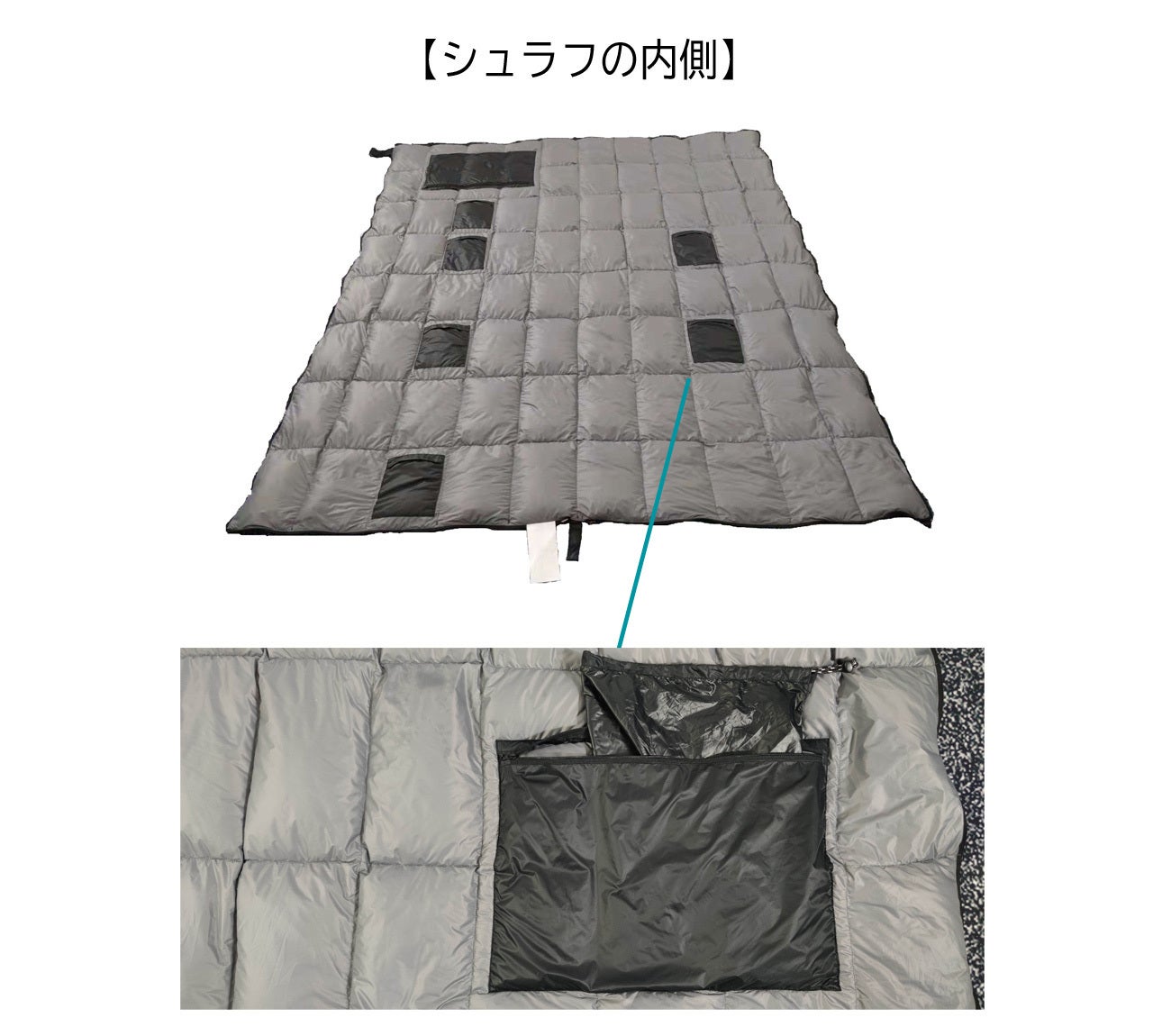 ※実際のシュラフは、お試しで使っていただいた方の声をもとにポケットは6個→10個に増やします。