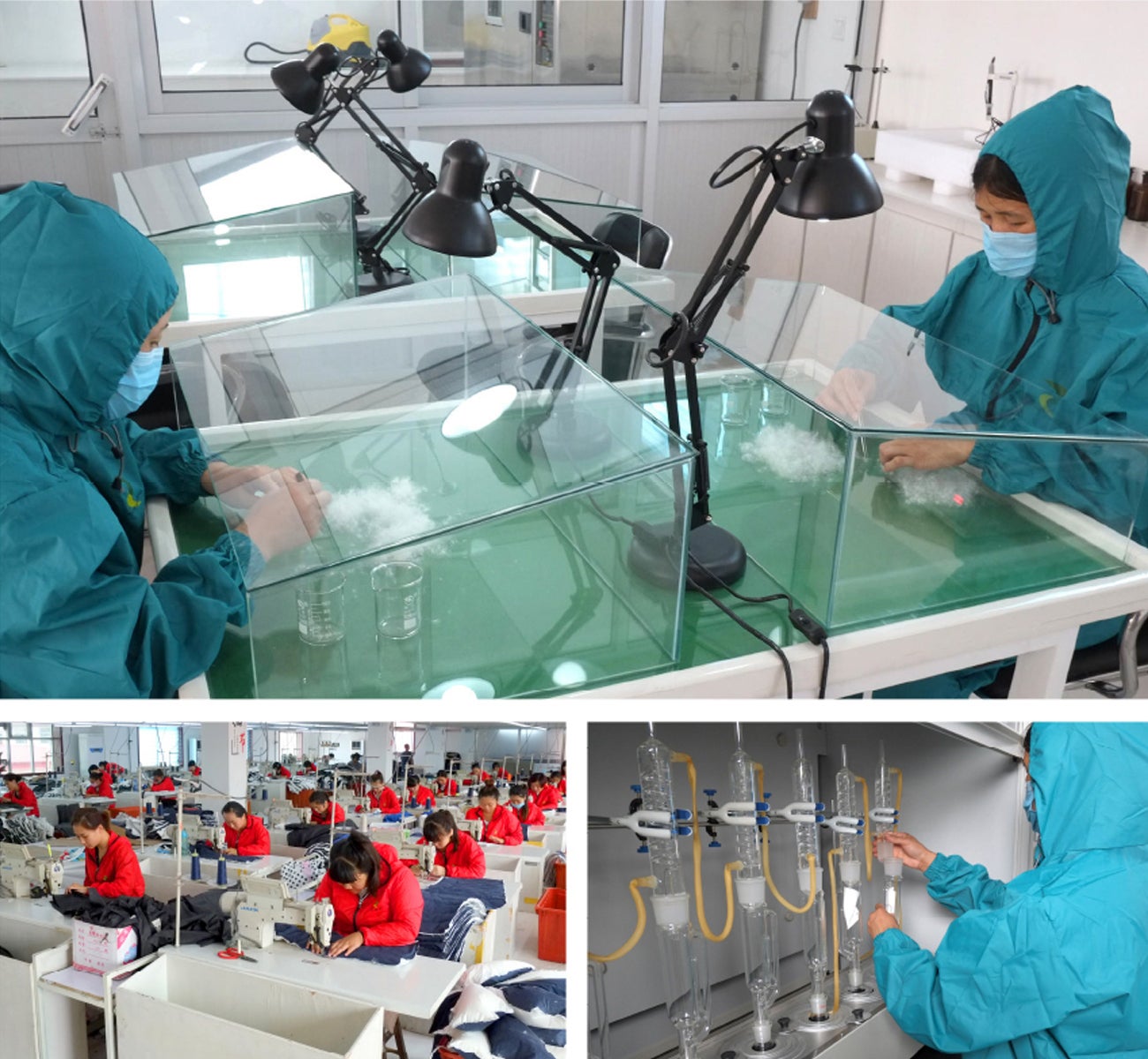 品質を左右する最も重要なポイントは、フェザー&ダウンの素材をどのように加工するかの技術力が鍵となります。洗浄、乾燥、焼成、冷却、分割などの様々な工程を経て、環境保護にも配慮した高品質の羽毛を使用しています。