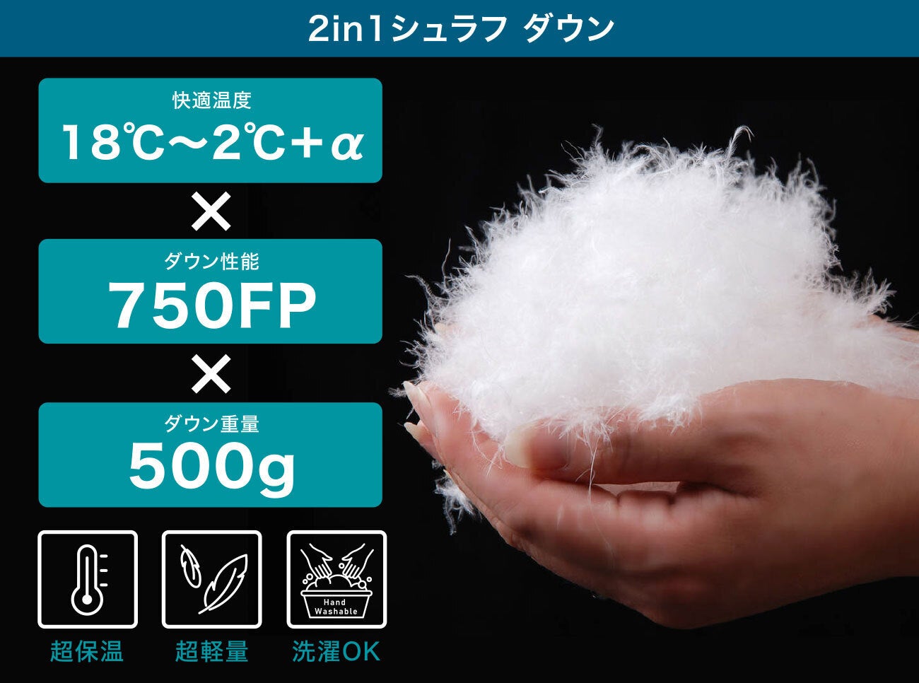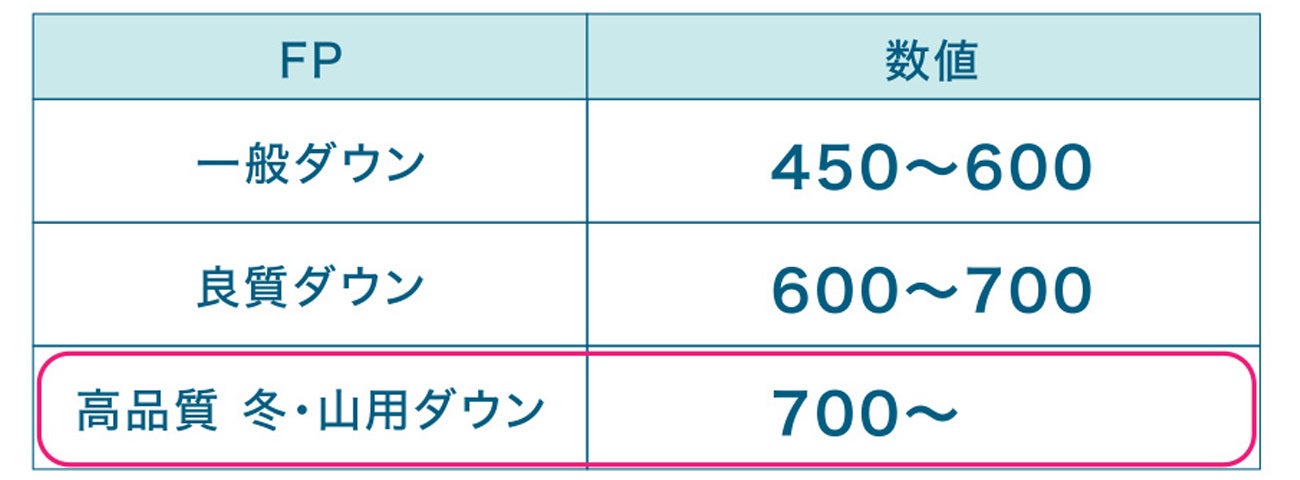 フィルパワーとは約28gのダウンを潰した反発力で、高ければ空気を多く含めるため、保温性も高くなります。2in1シュラフはFP750のダウンを採用しています。