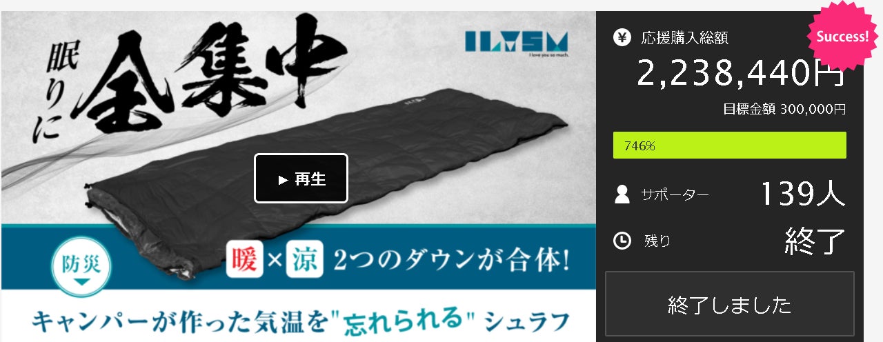 2022/02/17 09:00以前より、ご支援いただいた方からのお声で、シュラフを使ってみたいというお声をいただいておりましたので、商品発送までの間、試作品の貸し出しをさせていただいておりました。いくつか使っていただいたレビューをFacebookページに掲載しておりますので、ぜひご覧ください。いただいたコメントはそのままのせており、そのほうがご愛用頂く方の参考になると思っております。FBhttps://www.facebook.com/Ilysm-gear-103585165434254今後ともどうぞよろしくお願いします。ILYSM 田島 もっと見る超軽量・コンパクトで試作品の貸し出しでも人気をいただいているシュラフです!