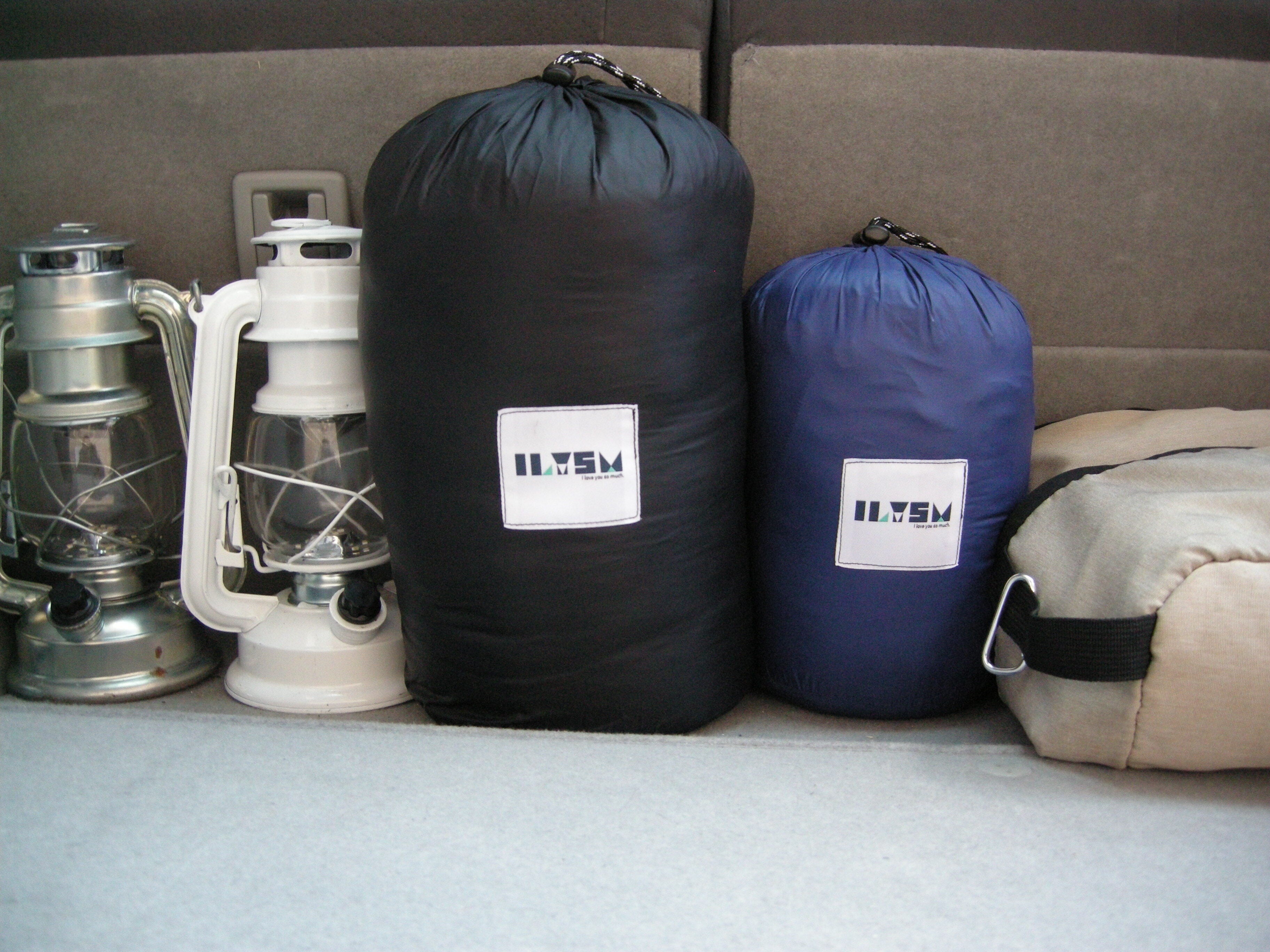 シュラフは家族分もとなるとかなりのスペースが必要です。ソロキャンプでもサイズはとても重要!2in1シュラフは高品質ダウン素材でミニマム化と軽量化に成功。シュラフ2つ合わせたサイズがペットボトル1.5L程度、夏用は500mL程度のサイズに納めました。