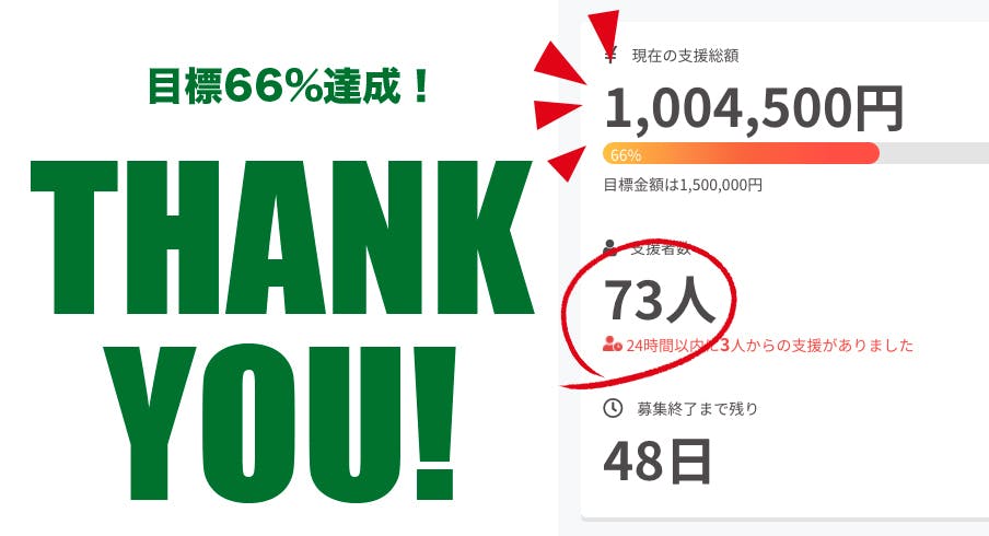 プロジェクトが始まってから10日が経過しました。たくさんの人からご支援いただき、すでに達成率66%で、73人もの方にご支援いただいております。