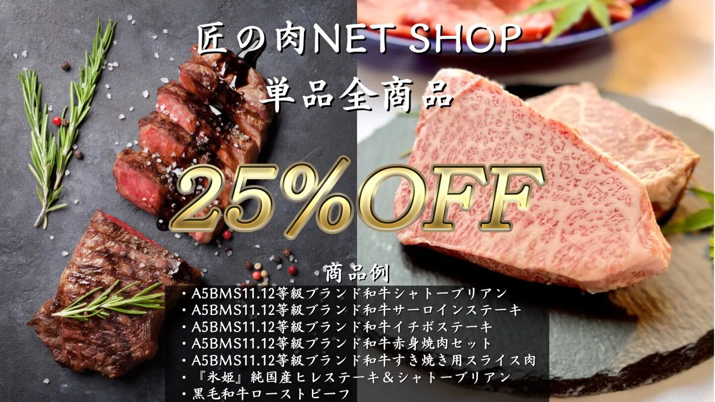 ・1年間匠の肉Net shopの単品全商品25%OFFで購入可能。