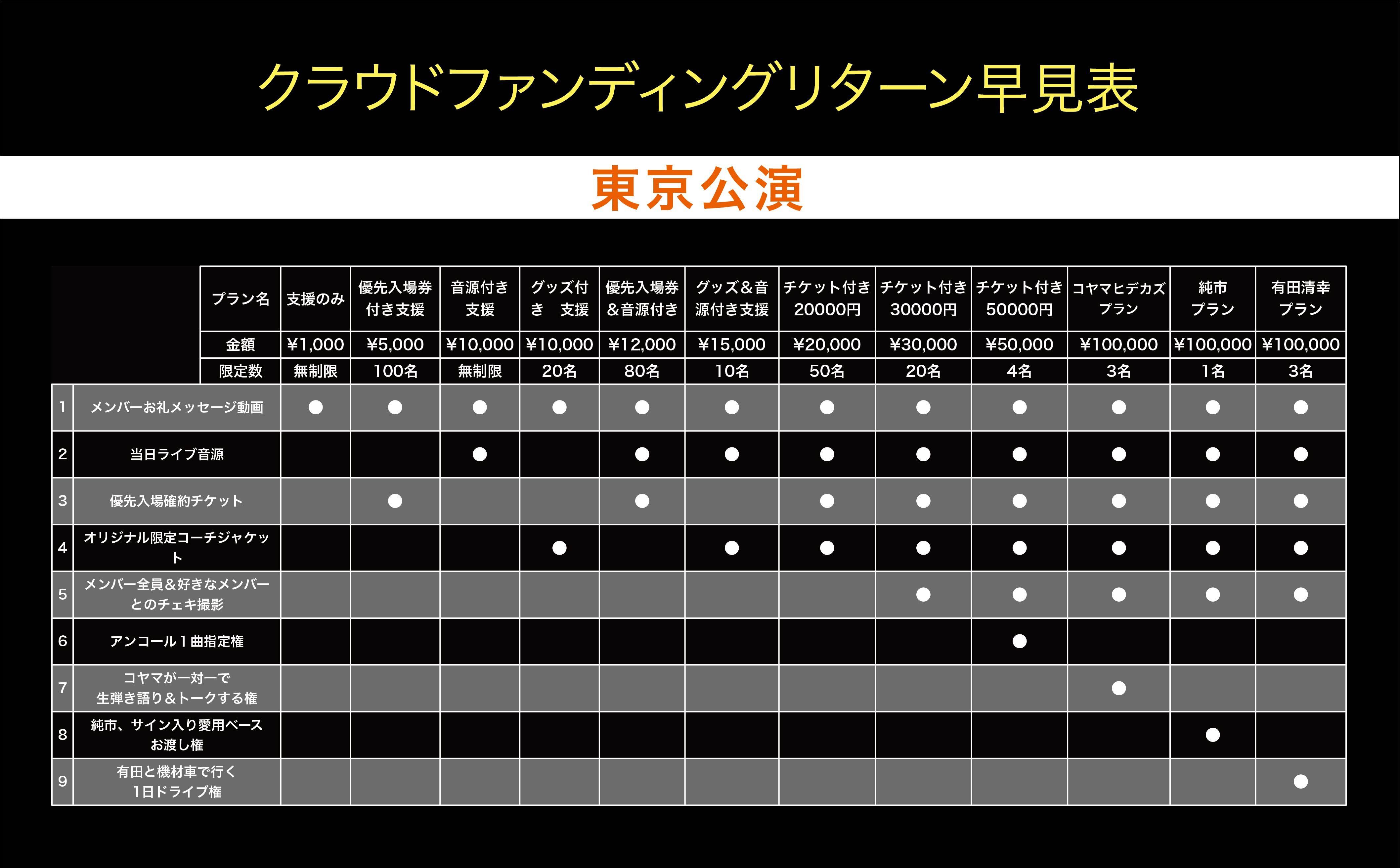 以上のことを踏まえ、リターンの中に含まれている「優先入場確約チケット」の上限数は、各会場のキャパシティに対してほぼ半分の人数になるよう各公演ごとに調整しています。