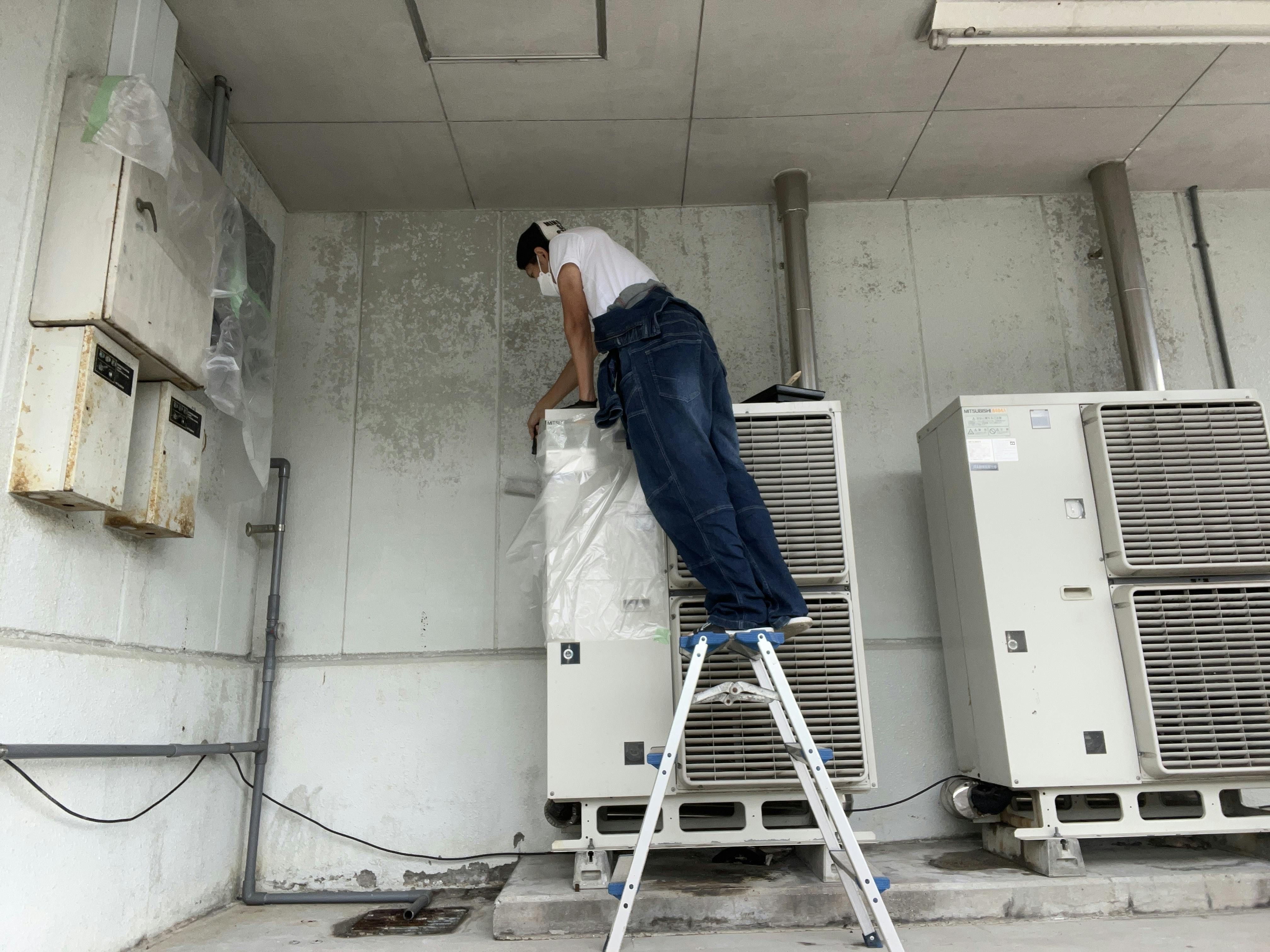 ということで、まず、高圧洗浄で壁の汚れを隅々まで落とし、乾いた後に色塗り前の下処理です。